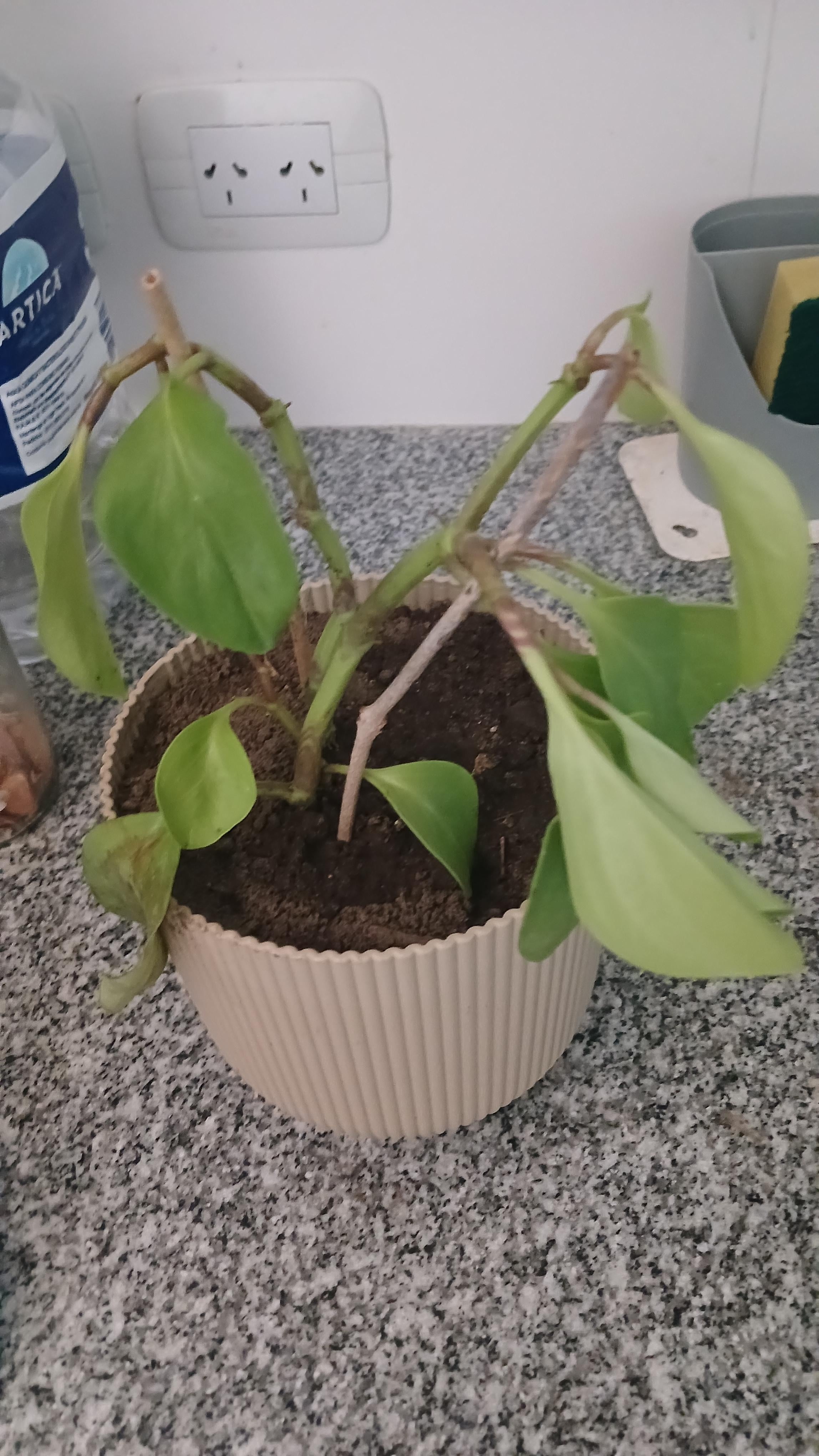 このように垂れ下がっているのを見つけて、鉢のスペースのせいだと思い、今の鉢に植え替えたのですが、なぜこのままなのかわかりません。それは何でしょうか?観葉植物なので昨日植え替えました。
