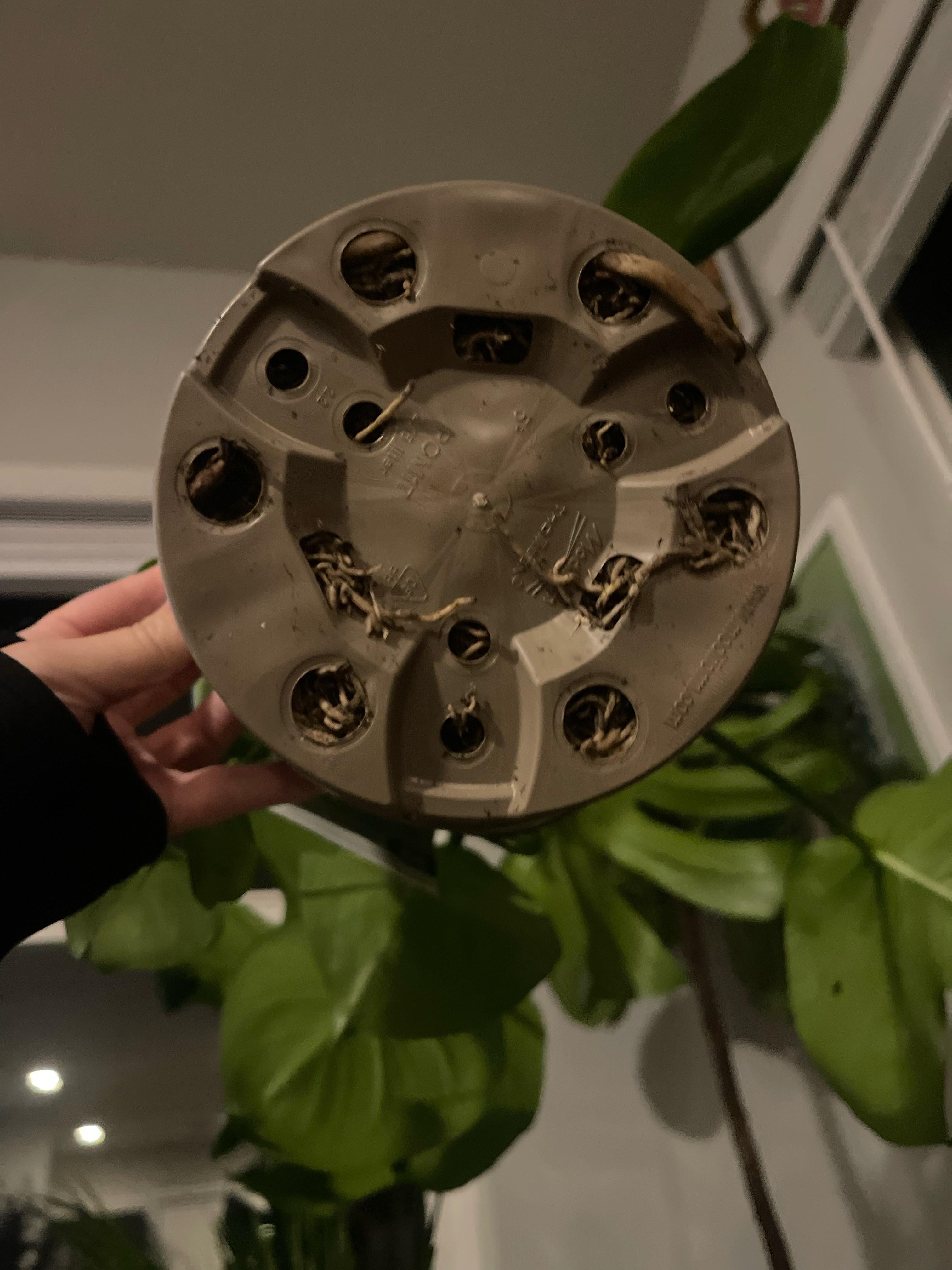 モンステラ デリシオサ。冬なのに根が鉢からはみ出してるので今植え替えるか、それとも春まで待つか?
