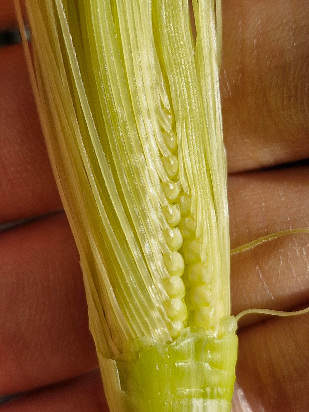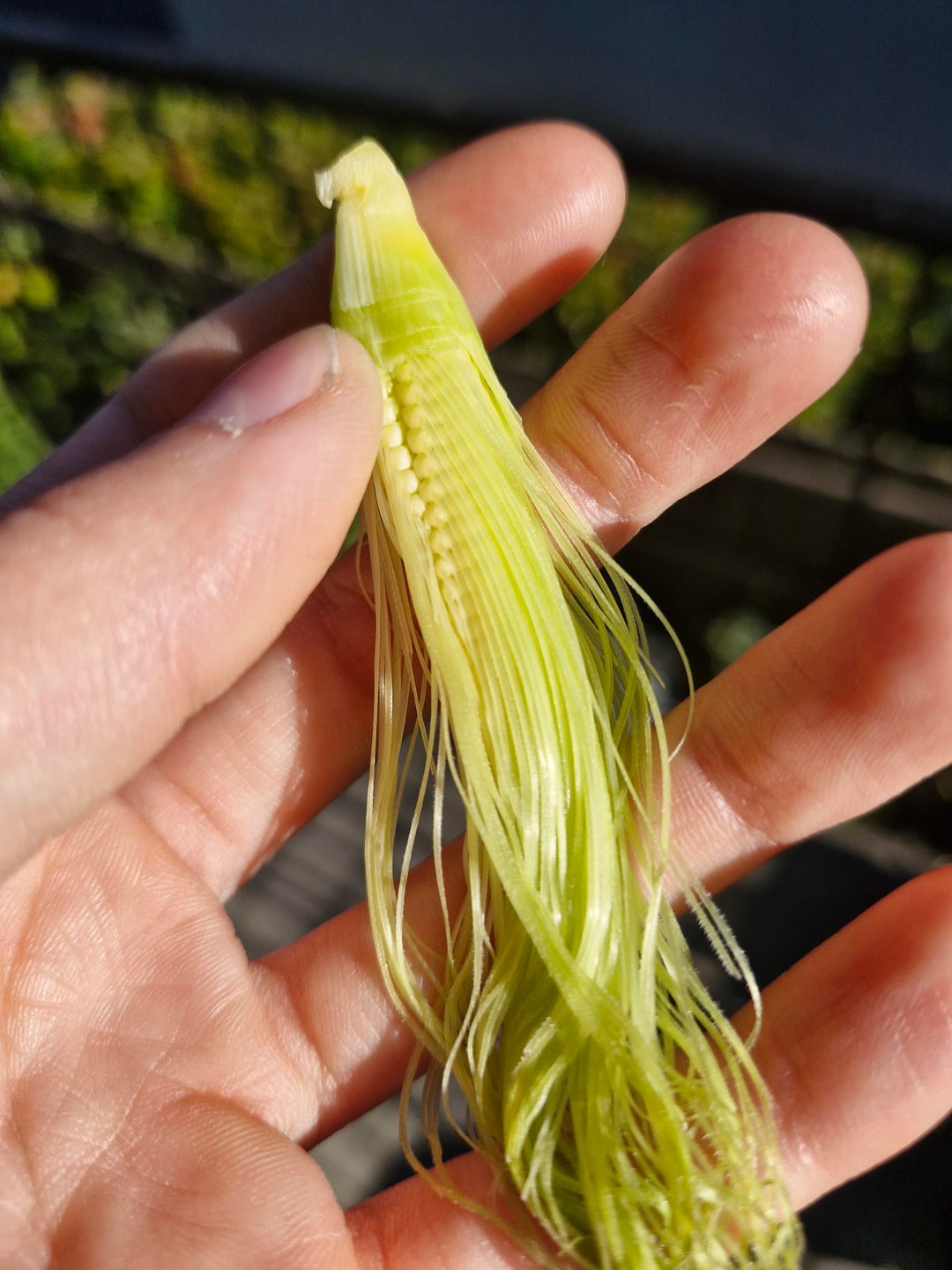 メルボルンでトウモロコシを栽培しているところ、小さな敷地にポールが倒れたため、損傷した茎を切り落とした。切り取られた茎から取れたベビーコーンは、絹の各糸がどのようにしてトウモロコシの単一の穀粒を直接成長させるのかを美しく見せてくれました。