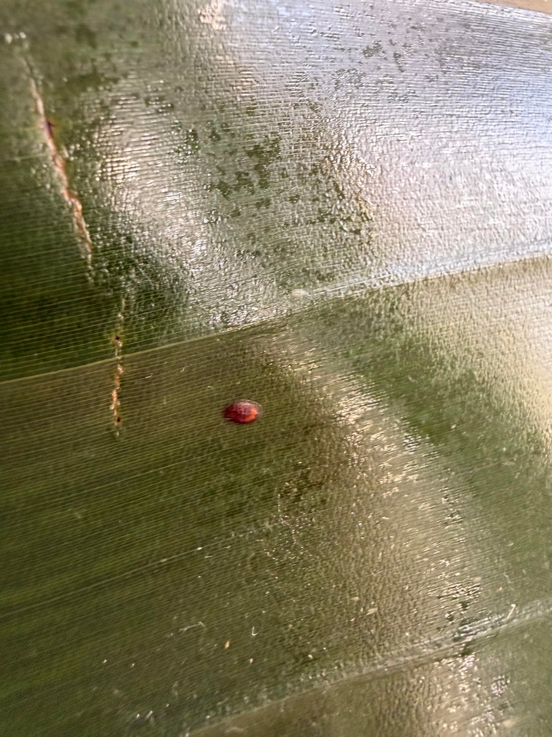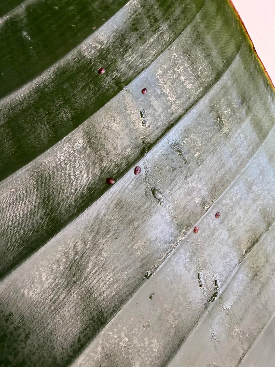 観葉植物にあるこの茶色/赤色の斑点は何ですか?消毒用アルコールで落ちます。