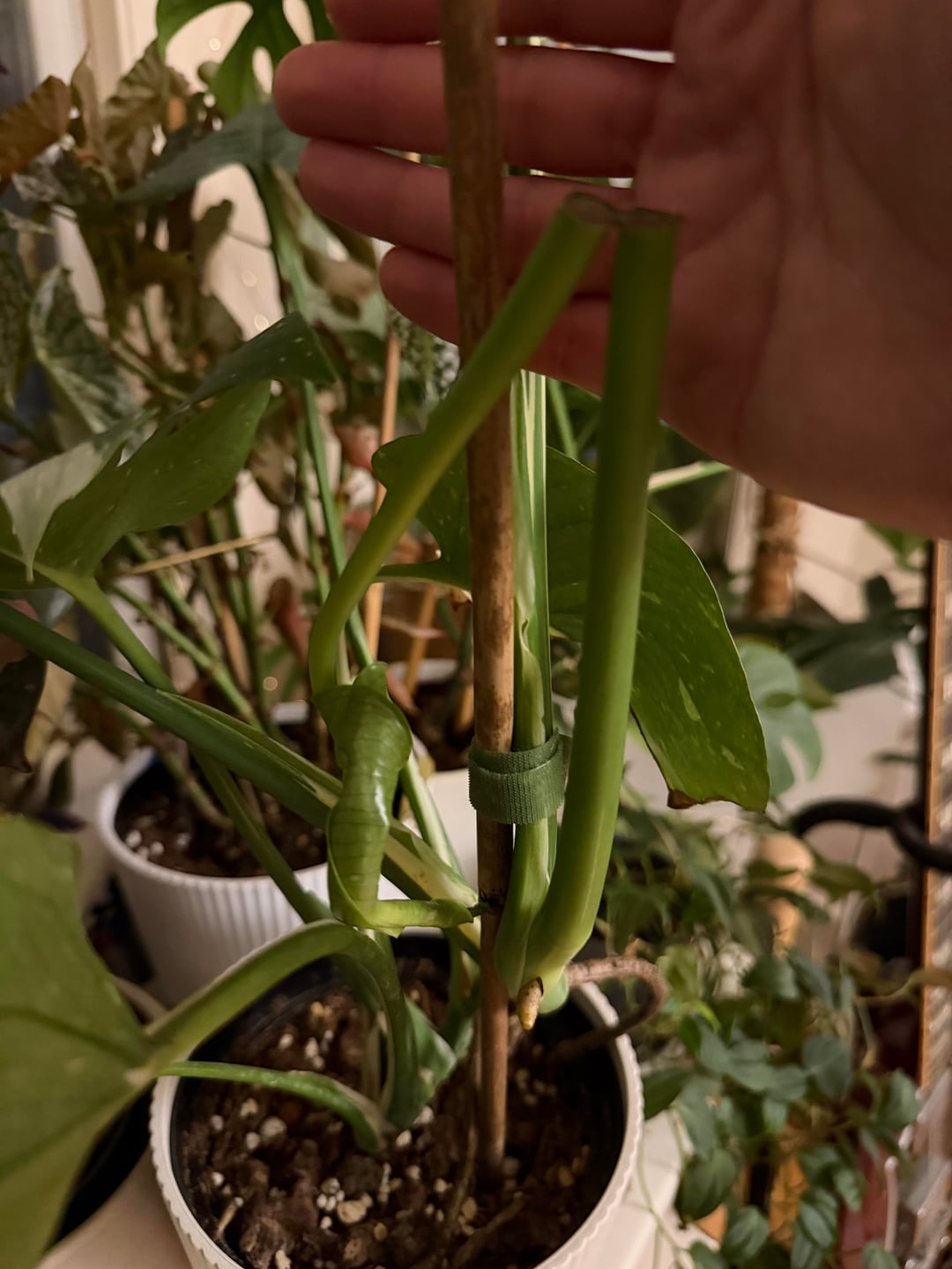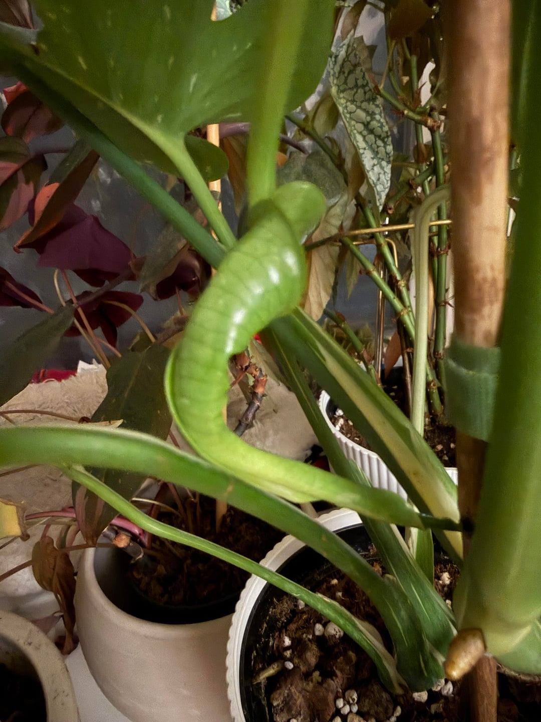これ以上大きくならないうちに、慎重にまっすぐに戻してプラスチックのストローで添え木をしてみようと思います。カル化した端が魔法のように元に戻るわけではないことはわかっています。これは、葉が生き残って重くなった場合に、自重で完全に折れてしまわないようにするためです。