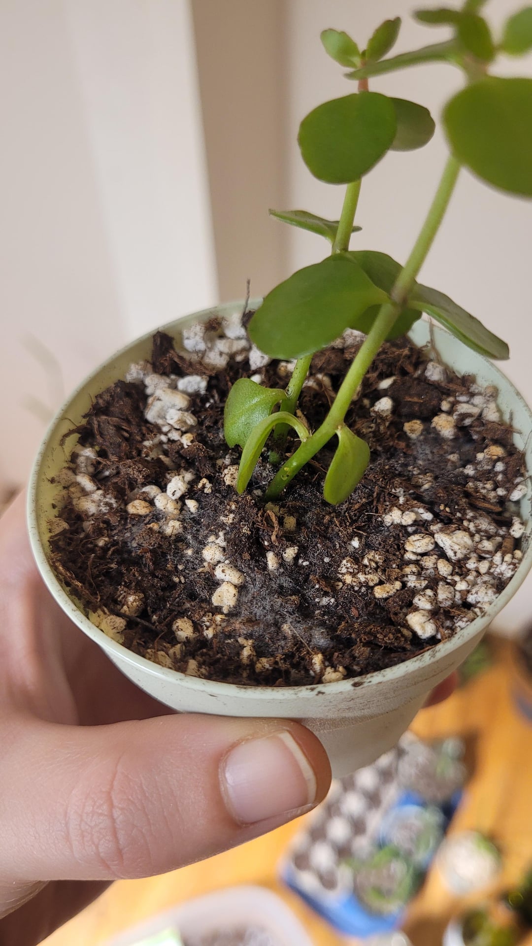 一般的にカビというと水のやりすぎを思わせますが、植え替えの時に一度軽く水やりをしただけで、それ以降はしていません。読んだ内容はどれも、たとえ多肉植物であっても、植え替えの際には水やりが必要であることを示しています。間違っていたら訂正してください。あと、ここは今、湿度がそれほど高くありません。土は「屋内用の多肉植物」を混ぜたもので、水はけが良いとされています。申し訳ありませんが、もう袋を持っていないので、もっと詳しい情報があれば教えてください。