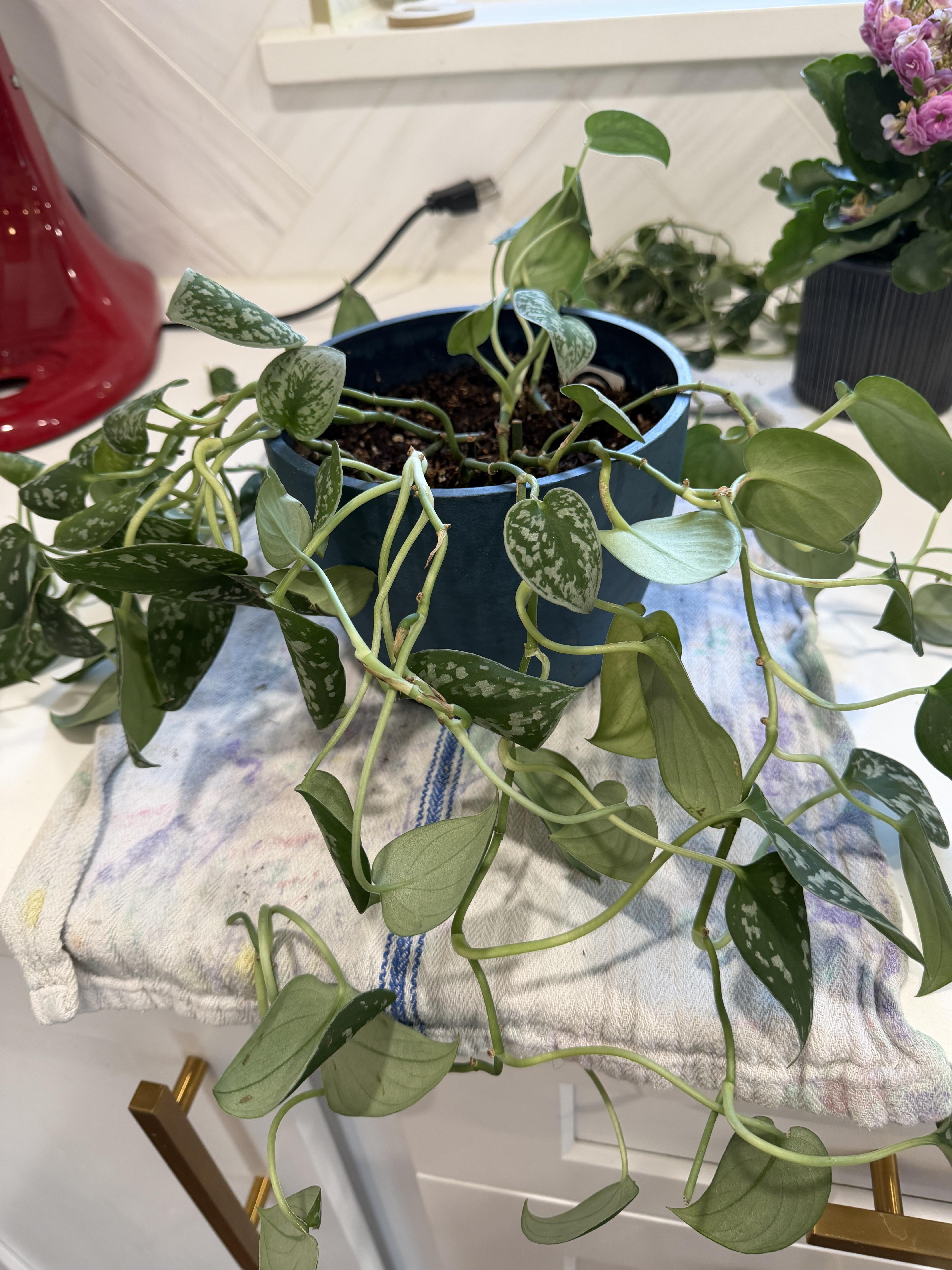 私が持っているこのシルヴウェ ポトスは、オンライン上の他のポトスの写真と比べて、葉がかなり小さいです。それは私が入手した品種だけでしょうか、それとも「キッチンキャビネットの上」にある植物だからでしょうか?ちょっと…下向きなのもそのせいでしょうか? (蔓はすべて3フィートの長さになりつつあったので、散髪したばかりです。また、蔓を1本鉢の周りに巻き付けて再発根させ、挿し木を水に入れて繁殖させてみようと思います。)