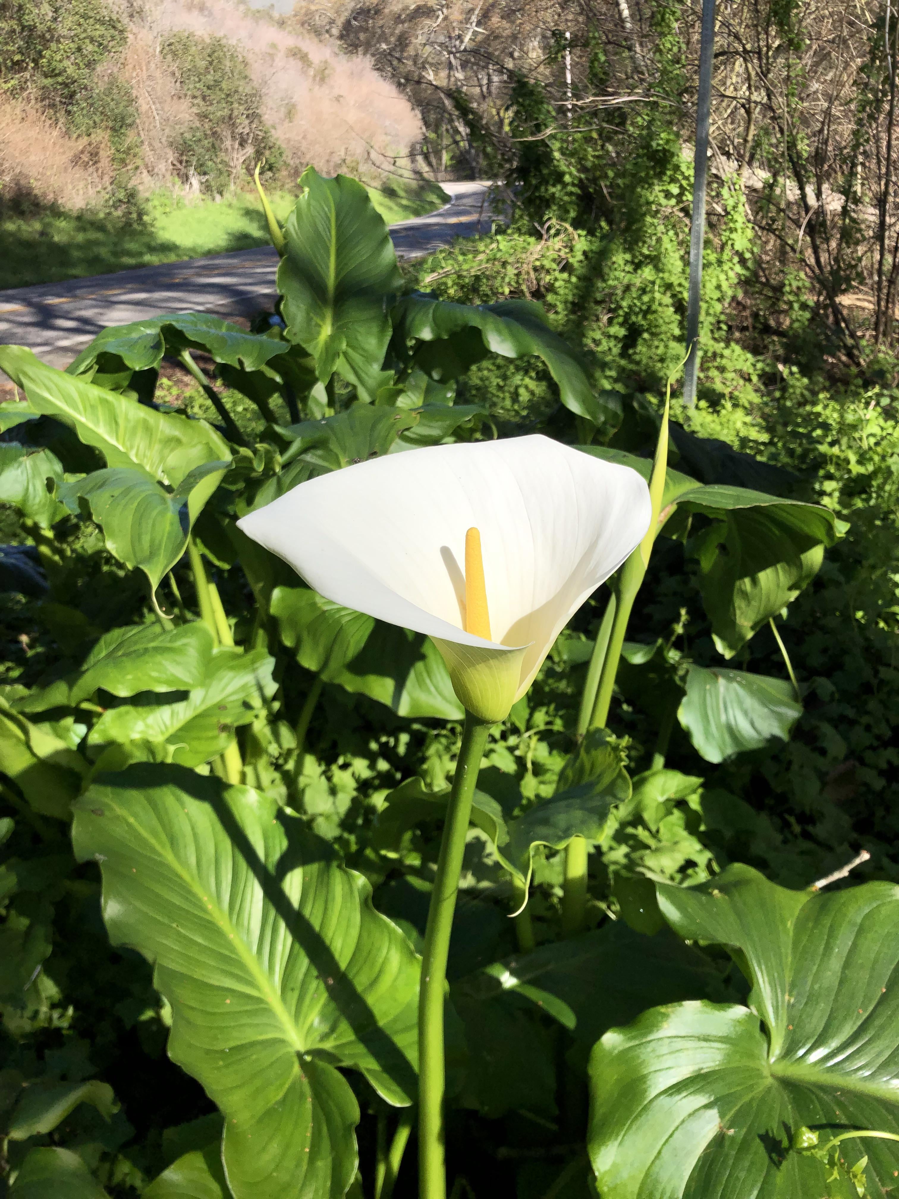 カリフォルニア州サンタクルーズ郡のボニードゥーンロード沿いに咲くオランダカイウユリ。