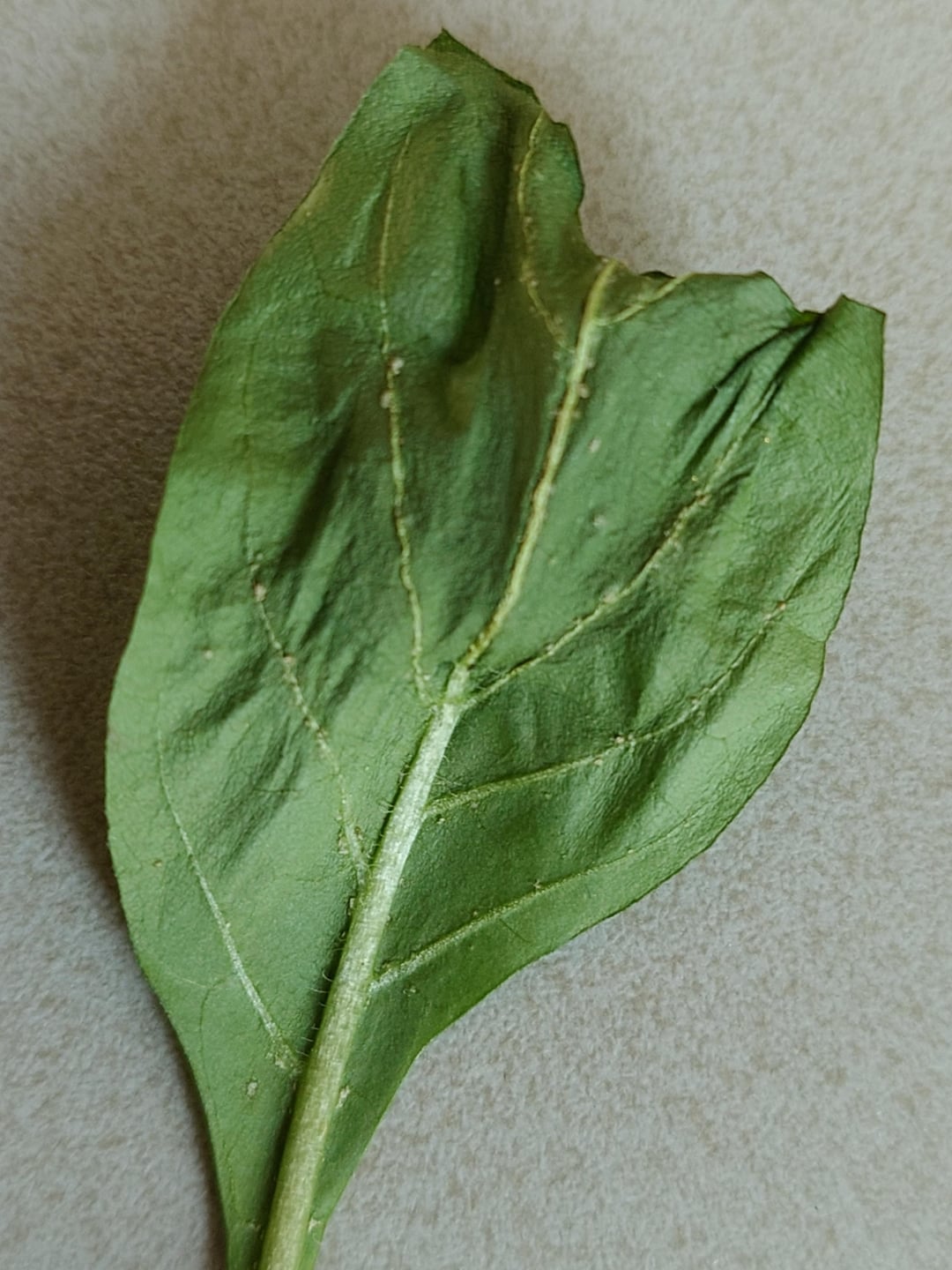 昨日、虫がいたのでアザミウマに感染しているのではないかと心配したので、消毒用アルコールと食器用洗剤を混ぜたものを全体にスプレーしました。成虫は1、2匹しか見かけませんでしたが、1本の植物の葉にその小さな緑色バージョンのようなものが何匹か見えました。アブラムシというよりは幼虫のように見えました。残念ながら写真を撮るのを忘れてしまい、今日は見つけることができませんでした(それが良いことだといいのですが)。葉の内側にあると思われる突起がいくつか見えます(写真5を参照)。