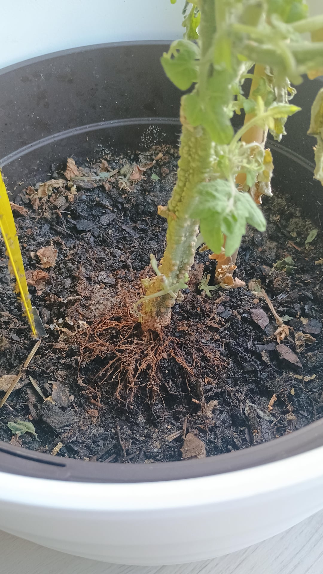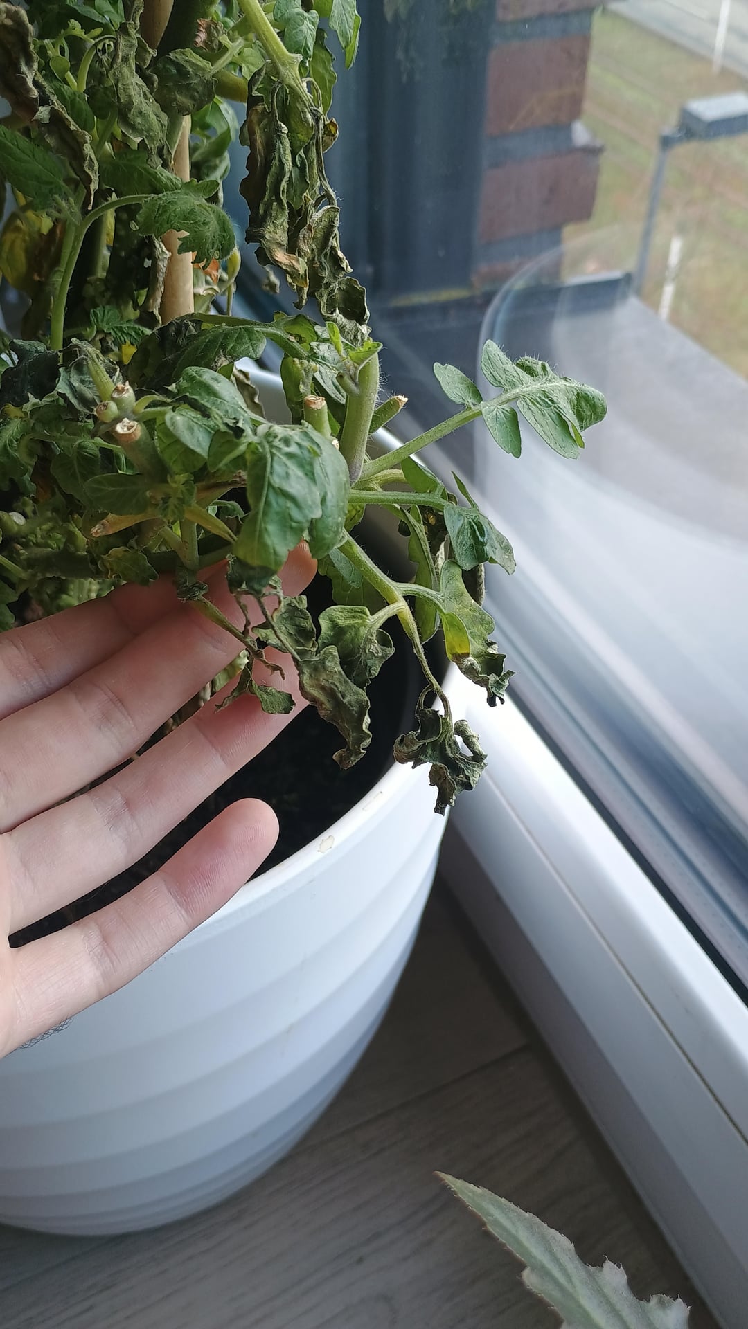 トマト栽培は初心者です。私はこれを1年飼っていますが、常に成長し続けているので、大きな鉢が必要になるほど成長したくなかったのでトリミングしています(スペースがありません)。旅行に行って友人に持っていき、2週間預かってもらいました。先週引き取りに行ったのですが、残念ながら帰りに15分ほど極寒(マイナス10度)にさらされてしまいました。多くの枝がすぐに乾いてしまったので、私の友人はそれの世話をうまくできなかったと思います。それが効果があるかどうかを確認するために、水を与えたり、栄養素を追加したりしてきましたが、見た目は日に日に悪化するばかりです。