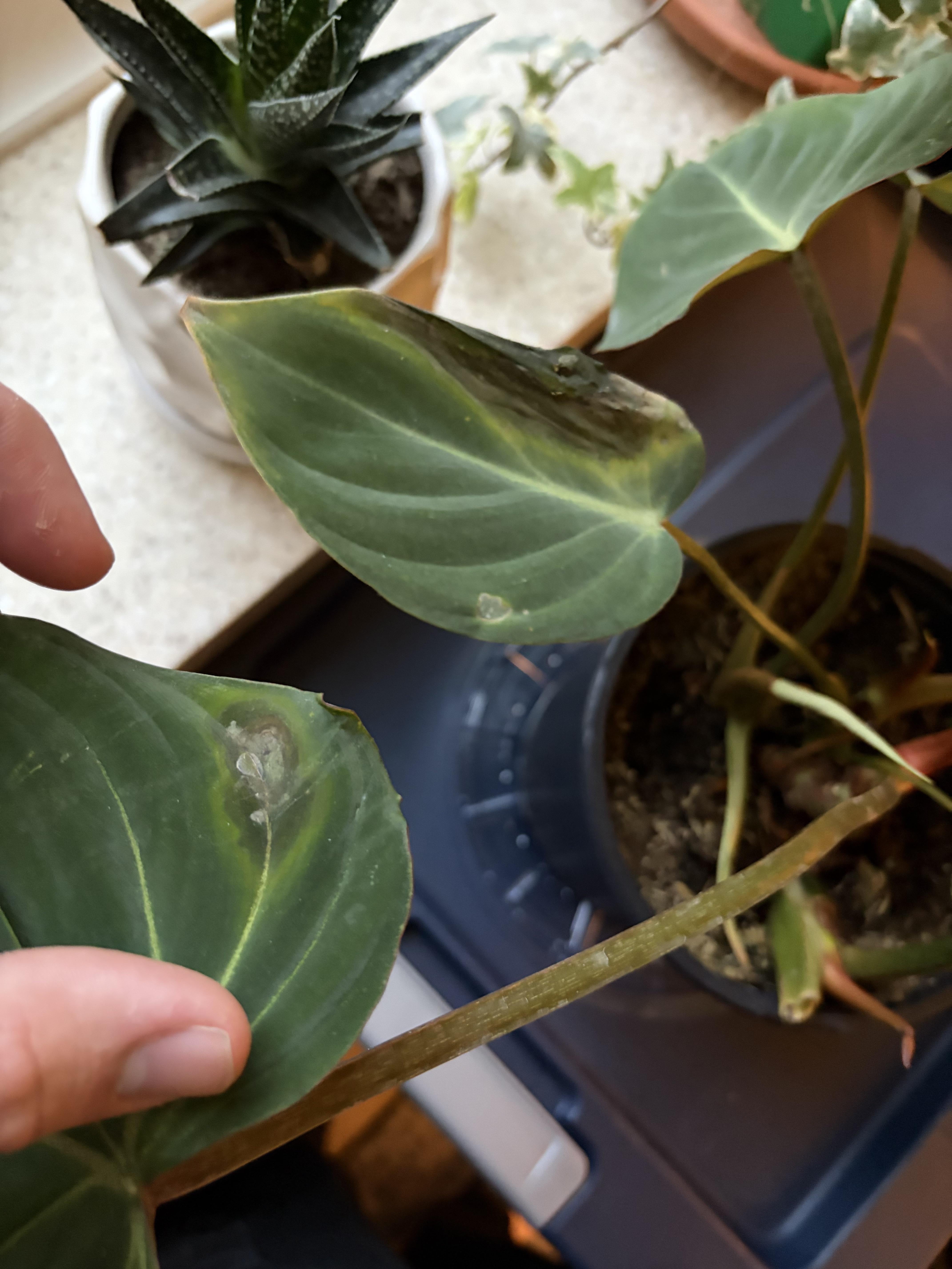 約1週間前にこの植物を拾ったばかりですが、中くらいの大きさの葉の3枚に奇妙な枯れた半透明の斑点ができ始めました。何が原因なのかわかりません。他に影響を受けていないように見えるはるかに大きな葉がいくつかあり、まだ大丈夫なように見える新しい葉がいくつかあります。これは私にとっても初めてのグロリオサムなので、通常のフィロデンドロンとは異なるこの植物の世話について知っておくべきことがあれば、知っておくと素晴らしいでしょう。 ありがとう。 🙂