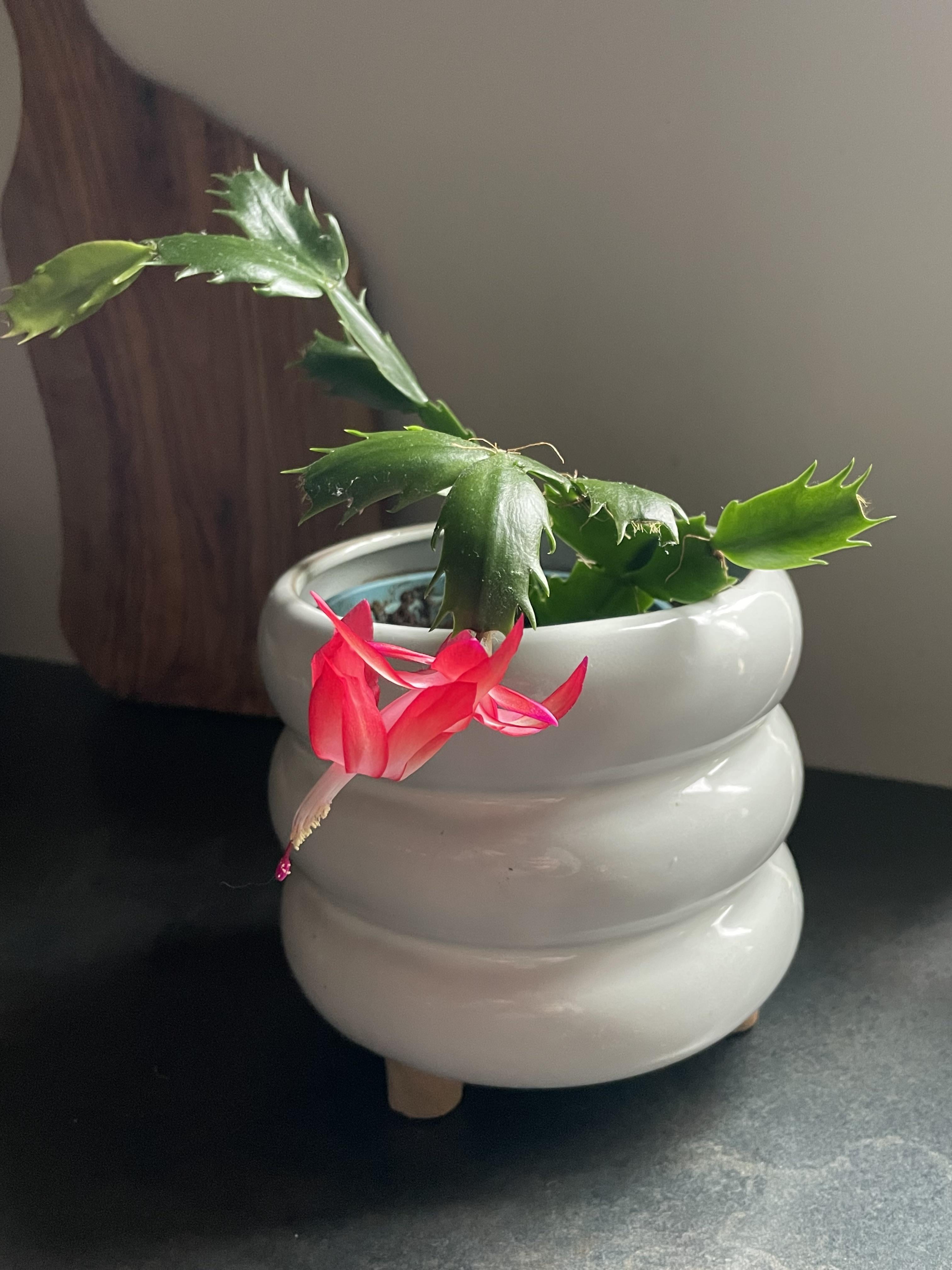 これは、昨年店頭で地面に落ちていた短いクリスマスサボテンから始まりました。家に持ち帰って土の中に置いたら、今では花が咲いて家を飾ってくれています。