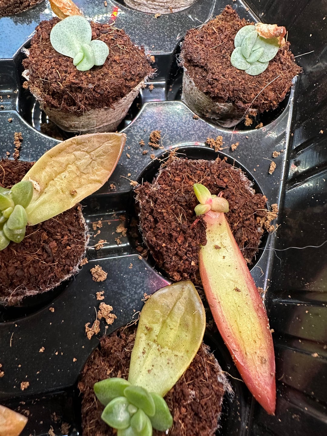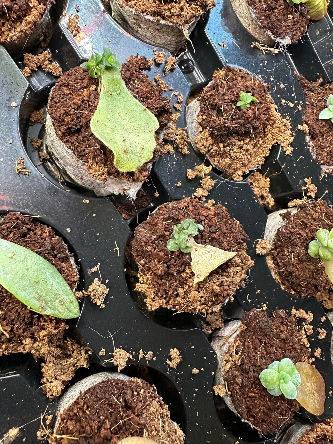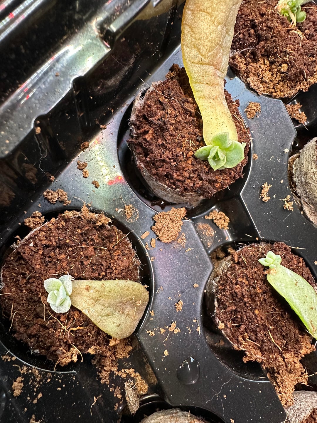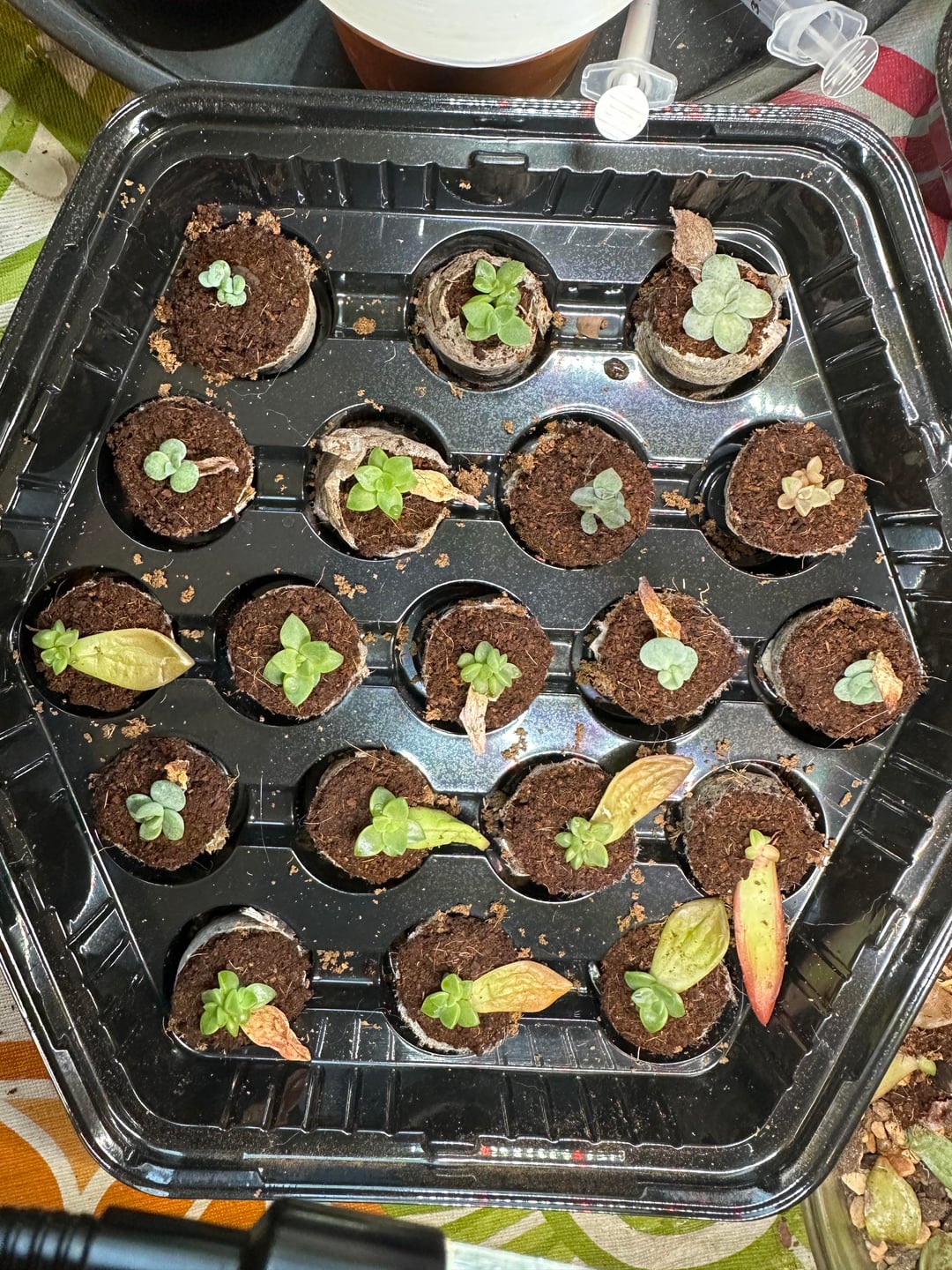 これらのプロップを開始してから約 90 日が経過しました。それらが大きな根系をもつほど大きく成長したら(または母葉が落ちて、植物が他の葉よりも頻繁に水やりを必要とする場合)、それらを土とコココイアが入ったスターターに移動します。トレイにはスターターに移動する必要があるものがいくつかありますが、スペースが不足しています。スターター トレイをさらに 2 ~ 3 個セットアップできるように、別のライトを注文したところです。