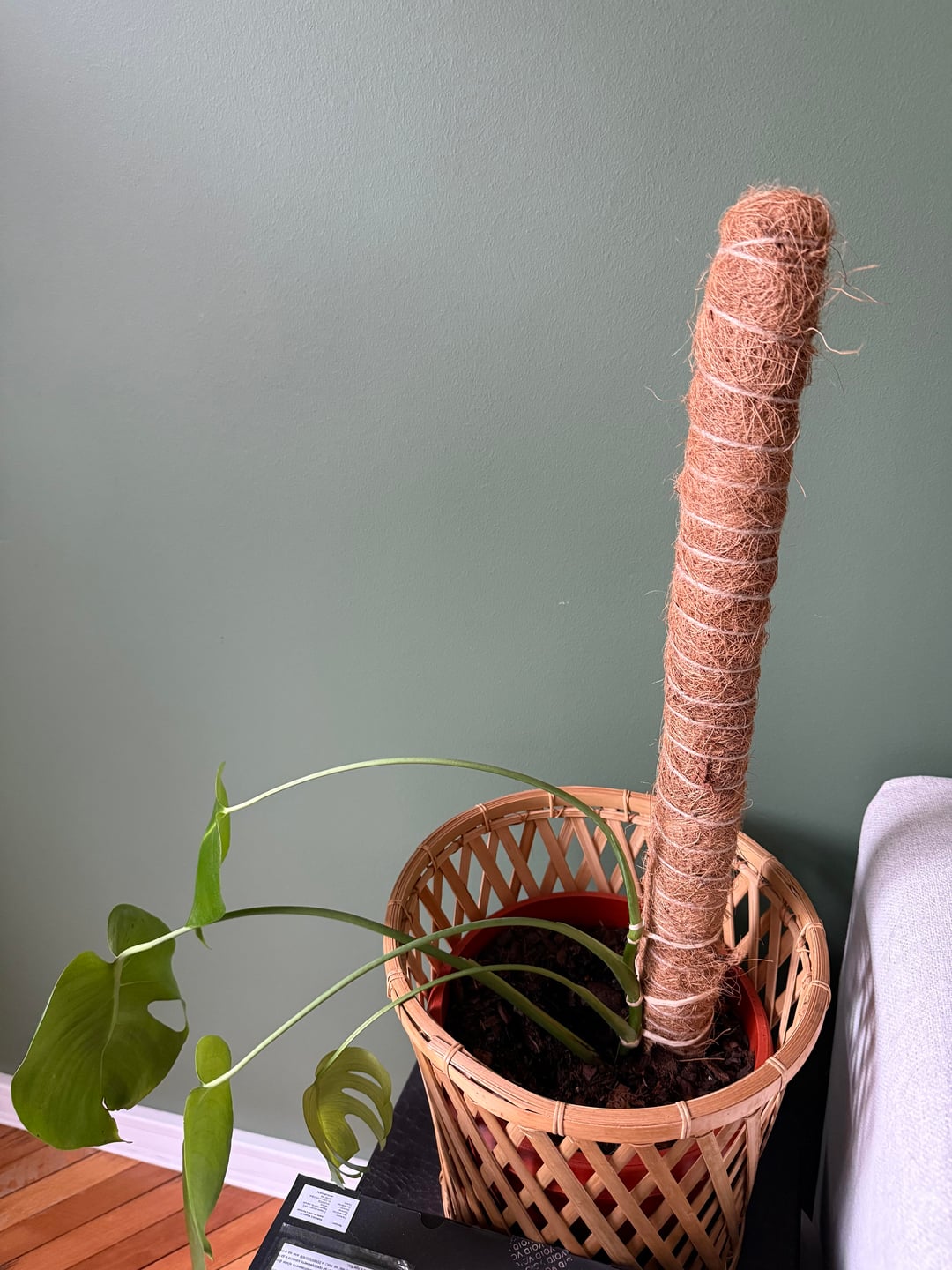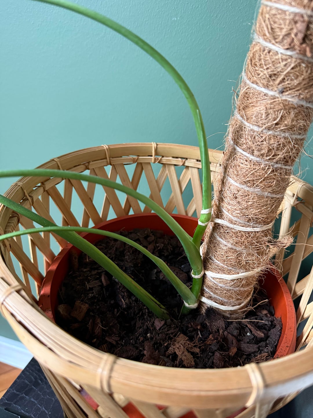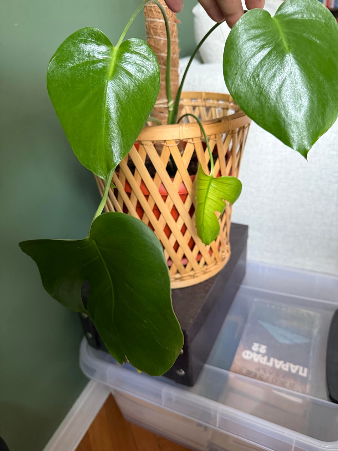 この贈り物を受け取ってから丸一年が経ちました。植物は悲惨な状態で、「写真で見ると一番大きな葉」が1枚だけあり、植物は曲がって損傷していましたが、なんとか救うことができました。それ以来、私はそれを植え替え、非常に慎重に水やりとスプレーをし、ポールに結び付け、茎を正しく配置する方法についての非常に正確な指示に従って、あちこちではなく「一方向」に成長できるようにしました。