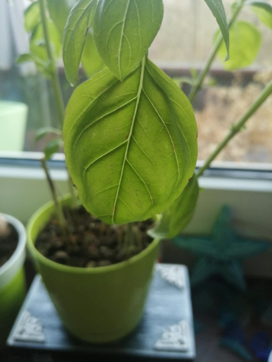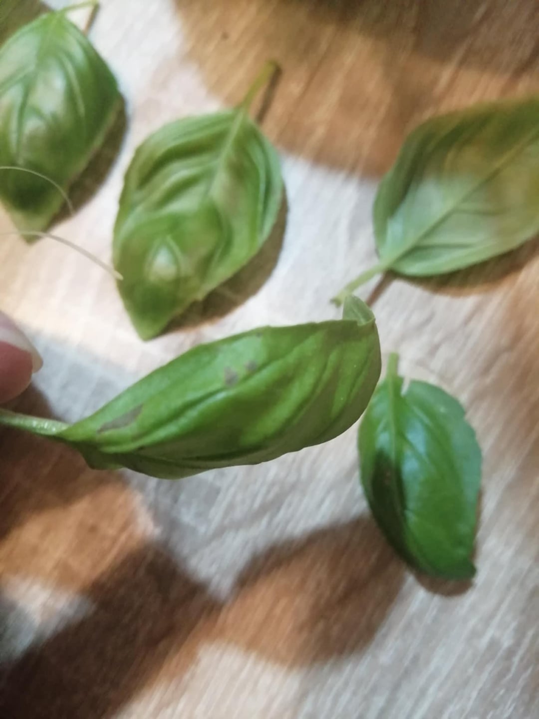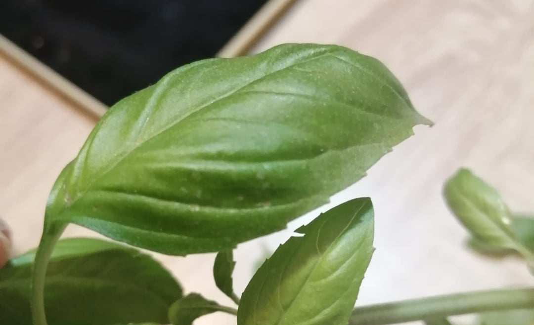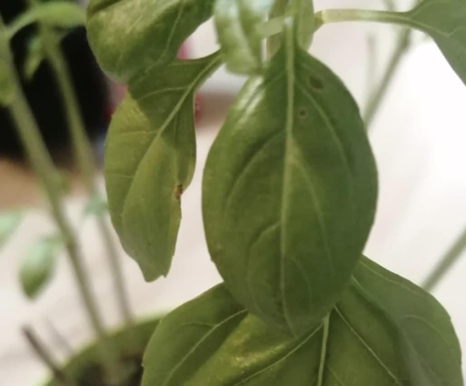 バジルを移植したかったのですが、暗褐色の斑点が気になりました。菌類、日光による変色、または水の多すぎが原因である可能性があると読みましたが、どれが原因であるかわかりません。写真では斑点が薄く見えるかもしれませんが、実際にはもっと目立ちます。あと、葉っぱが1枚だけ白っぽいのがあります。 (また、先日、茶色い葉っぱのほとんどを切ったので、この植物には葉があまりありません)。冬で太陽があまり当たらないこともあるので、窓から日光が当たり、近くのランプが当たる窓辺に置いてあります。誰かヒントがありますか?