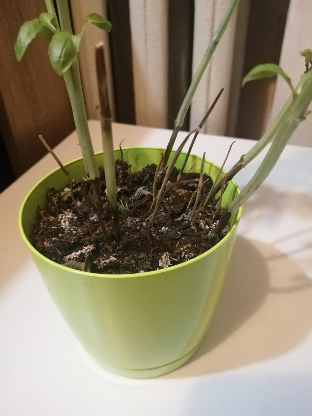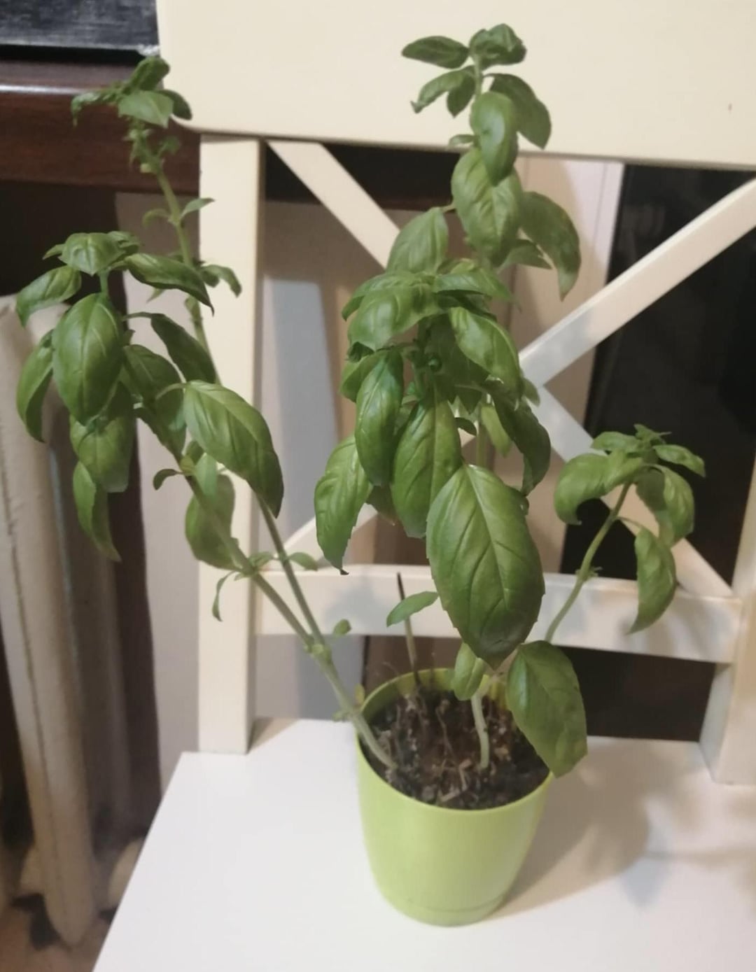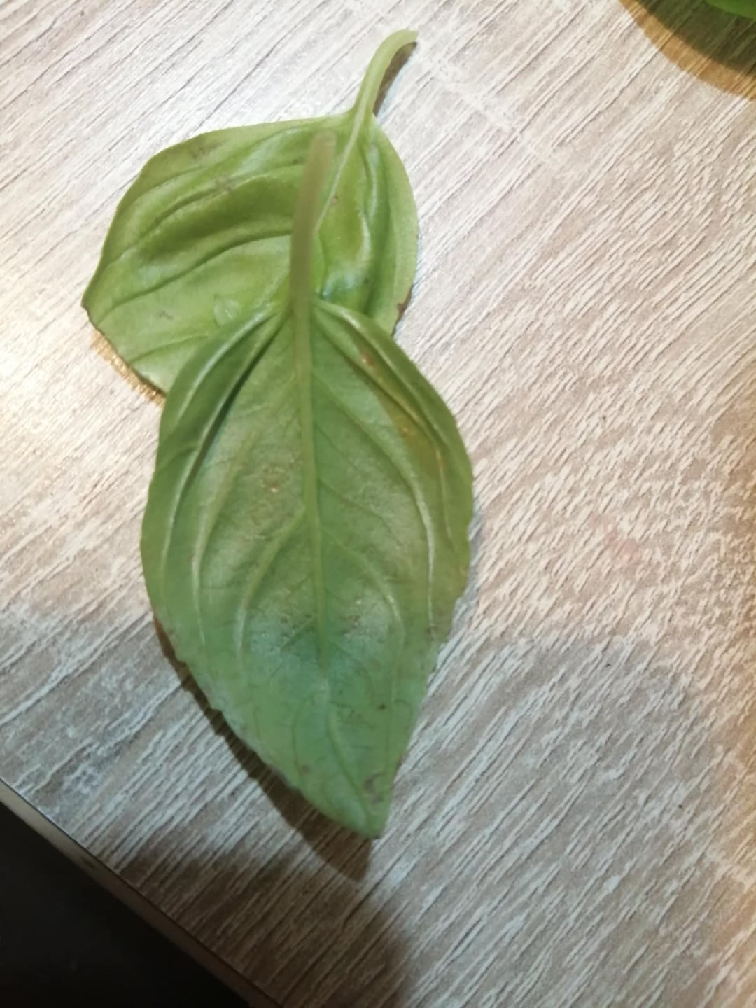 バジルを移植したかったのですが、暗褐色の斑点が気になりました。菌類、日光による変色、または水の多すぎが原因である可能性があると読みましたが、どれが原因であるかわかりません。写真では斑点が薄く見えるかもしれませんが、実際にはもっと目立ちます。あと、葉っぱが1枚だけ白っぽいのがあります。 (また、先日、茶色い葉っぱのほとんどを切ったので、この植物には葉があまりありません)。冬で太陽があまり当たらないこともあるので、窓から日光が当たり、近くのランプが当たる窓辺に置いてあります。誰かヒントがありますか?