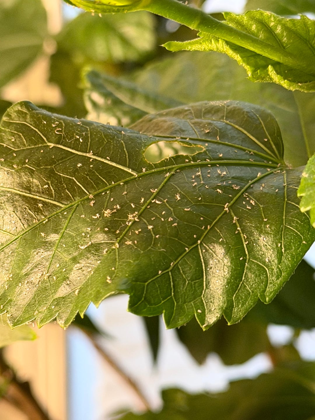 今日、ハイビスカスの木をチェックしていたら、花の下に虫のようなものがあることに気づきました。どれも動いているようには見えませんが、この葉と植物の周りの他の葉、そして床に何か汁っぽい物質があることに気づきました