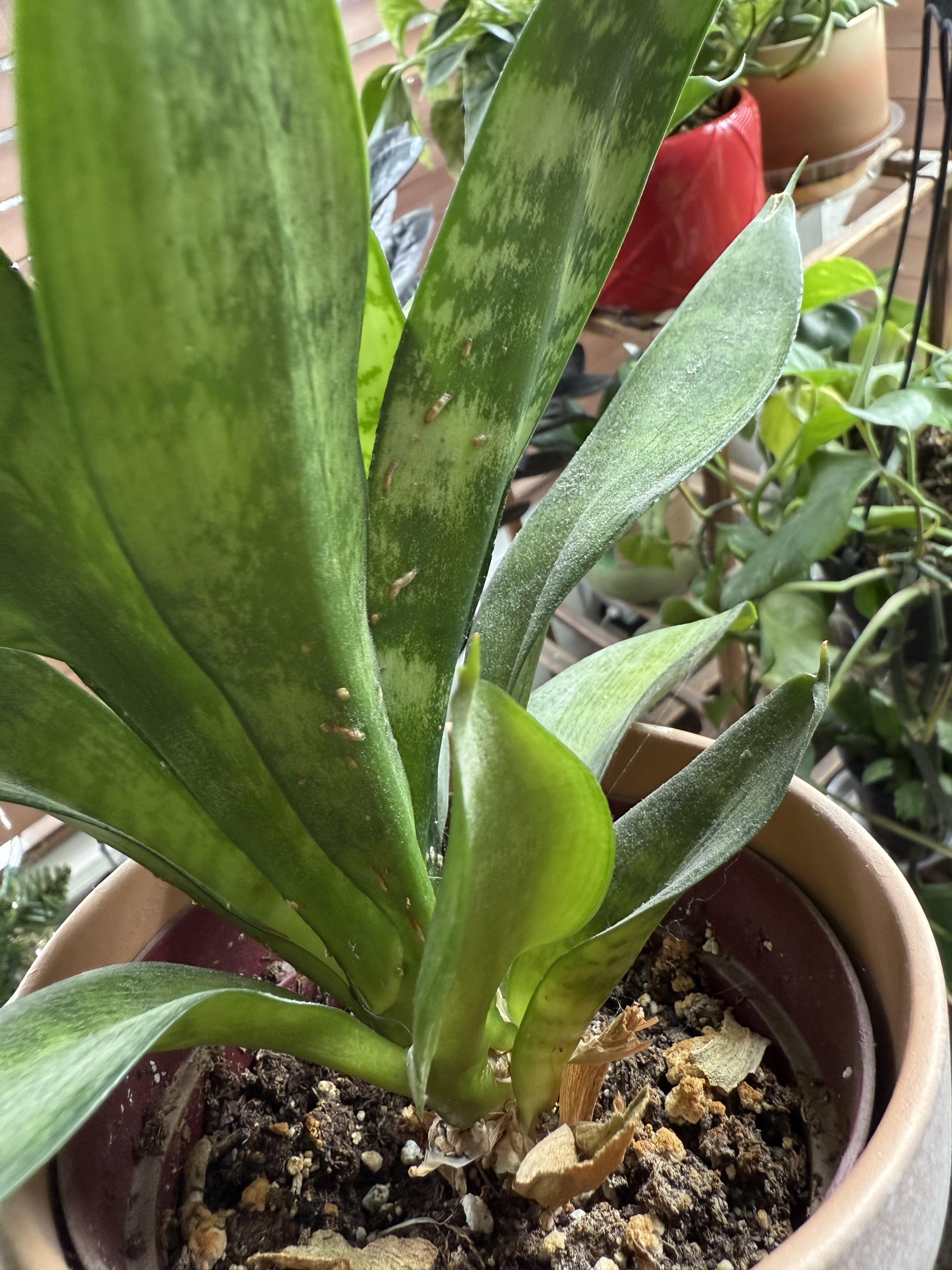それで今朝、植物を観察していたら、ある植物に小さな黒い虫がついていることに気づきました。ある植物を隔離した後、残りの植物を見直すことにしました。そして唯一目を逸らしたのはこのヘビ植物でした。これらの奇妙な斑点は、私が心配する必要があるもののように見えますか?週に一度水やりをし、窓際に置いています。