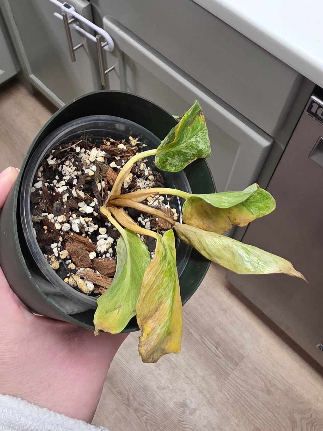 私はこのフィロデンドロン・ギガンティウム・ブリザードを赤ちゃんの頃にオンラインストアで注文しました。私にたどり着くまでに長い時間がかかりましたし、ここは真冬の真っ只中なので、コールドショックを受けたと思います。治癒後に新しい芽が生えるかもしれないことを期待してこの鉢に入れておいたほうがいいでしょうか、それともダメなので根元から切って水に挿して新しい根が生えるかどうか確認してみてはいかがでしょうか? 😅ありがとう!