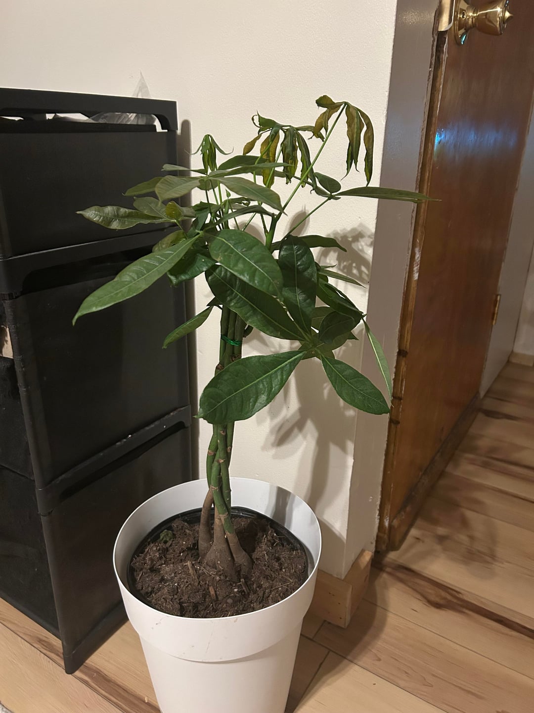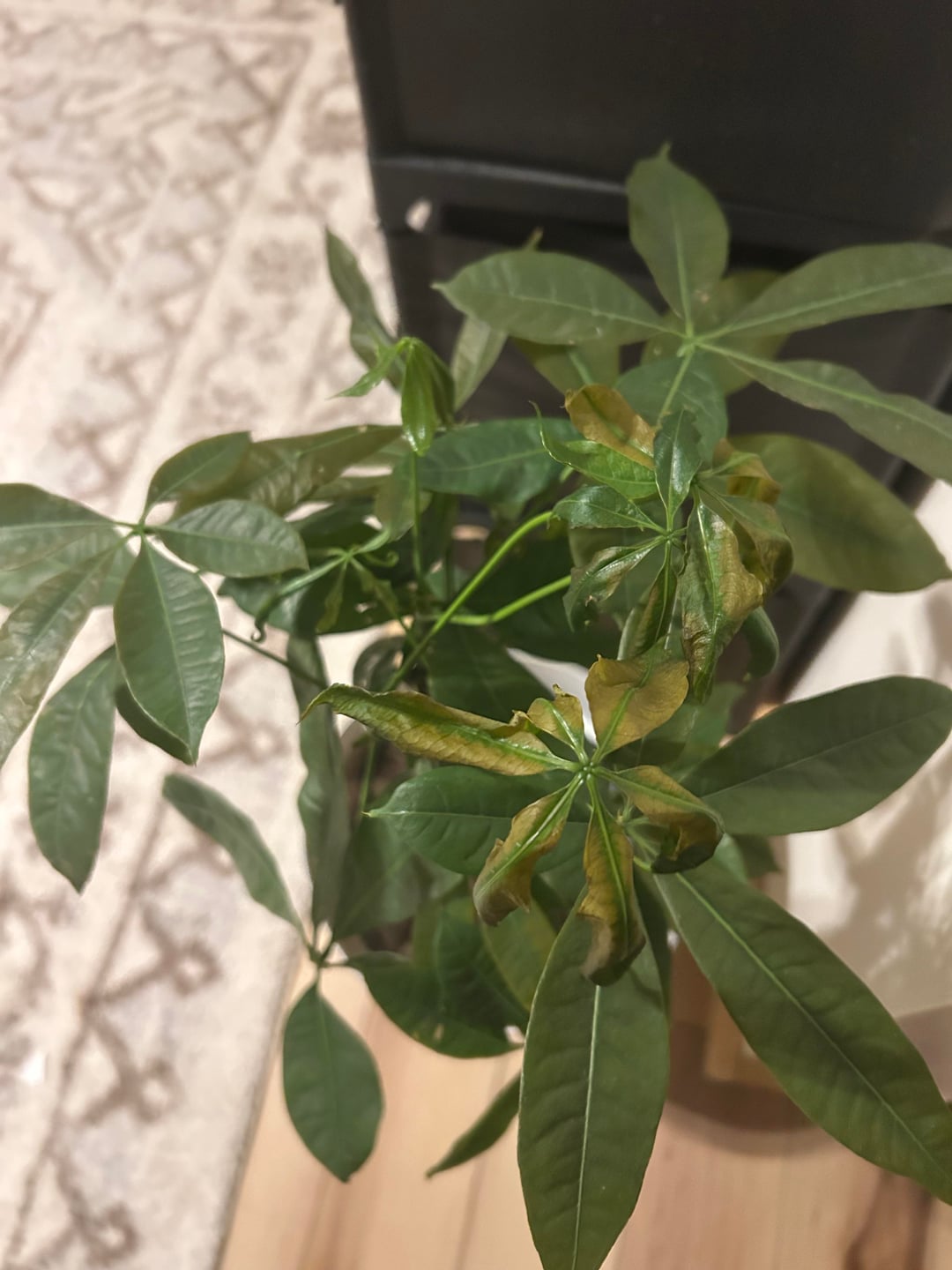 昨日この金のなる木を手に入れたのですが、今日気づいたのですが、葉が茶色になり、ベビーリーフがふわふわしていることに気づきました。購入してからまだ水やりをしていませんが、水分計は8〜9を示しています。
