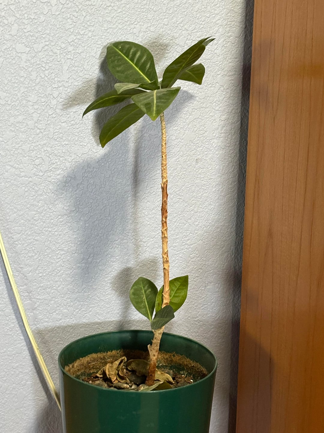 私の母はこの植物を数年間飼っていますが、見た目がさらに悲しくなります。葉が落ちてきました。それは何ですか?どうしたら助けられるでしょうか?定期的に水やりをしているそうです。かなり明るい部屋(天窓)にありますが、追加の光は受けず、窓の近くにないため、十分な光が得られていない可能性があります。下葉のすぐ上で切ってもいいでしょうか?