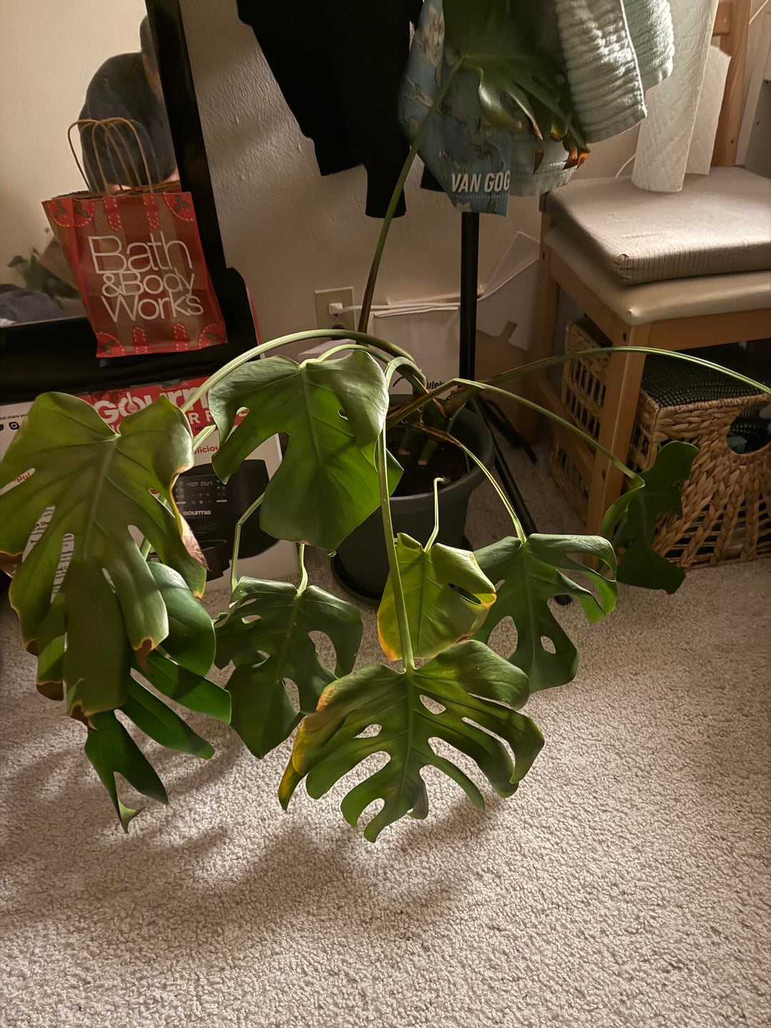 この状態が4~5か月続いていますが、何が起こっているのかわかりません。私はモンステラに定期的に水やりをしており、最近(約 1 か月前)新しい土に植え替えました。それなのに、うちのモンステラは2時間しか寝ていないみたいで、ベッドから起き上がろうとしても元気がありません!!!!葉は、縁が黄色くなっているいくつかの葉を除いて、すべて緑色です。回復するには何をすべきかについて何かアイデアはありますか?アドバイスやご協力をいただければ幸いです。