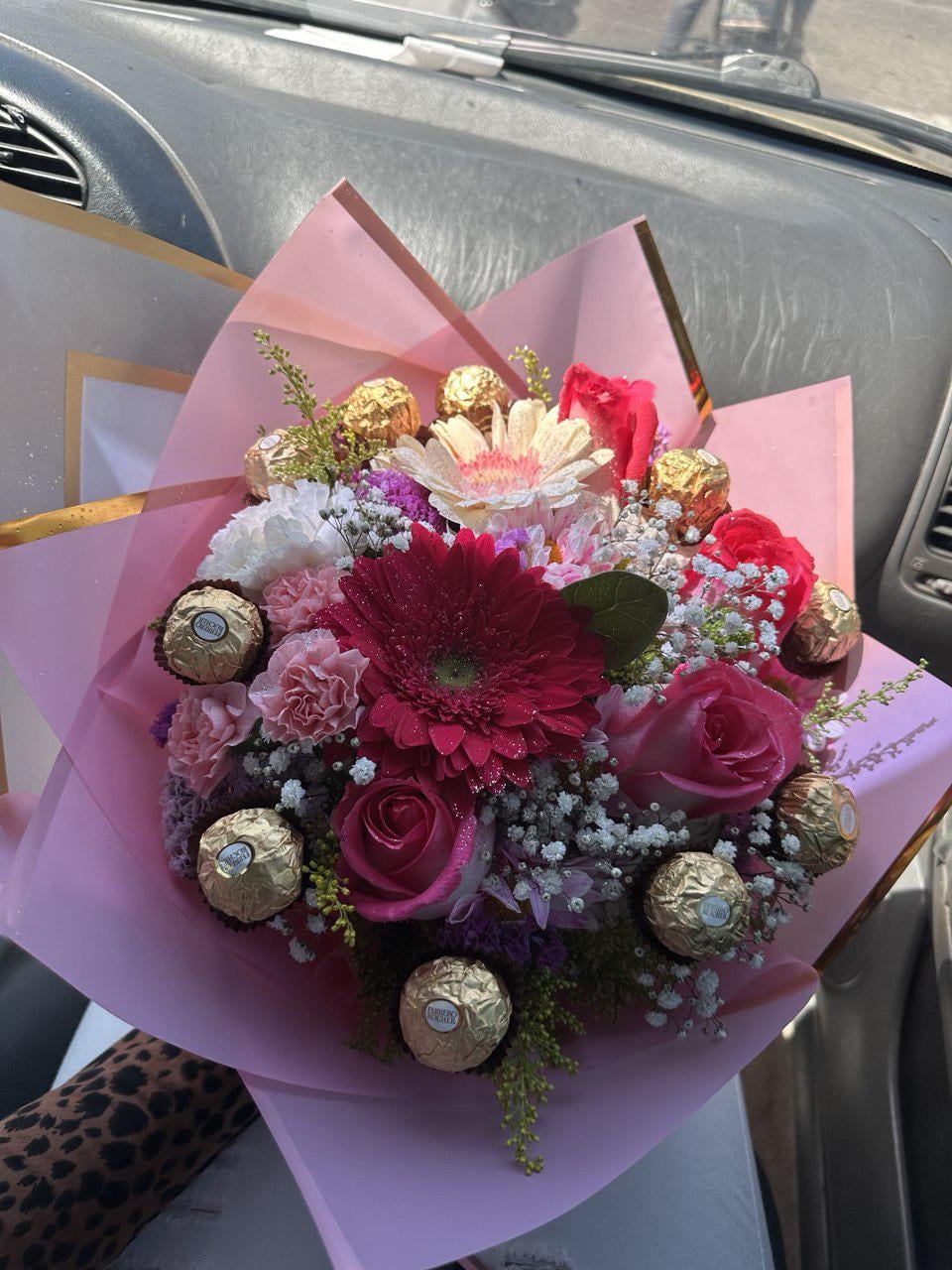 お花とチョコレートを組み合わせた、柔らかな色合いとハッピーな雰囲気のブーケ。