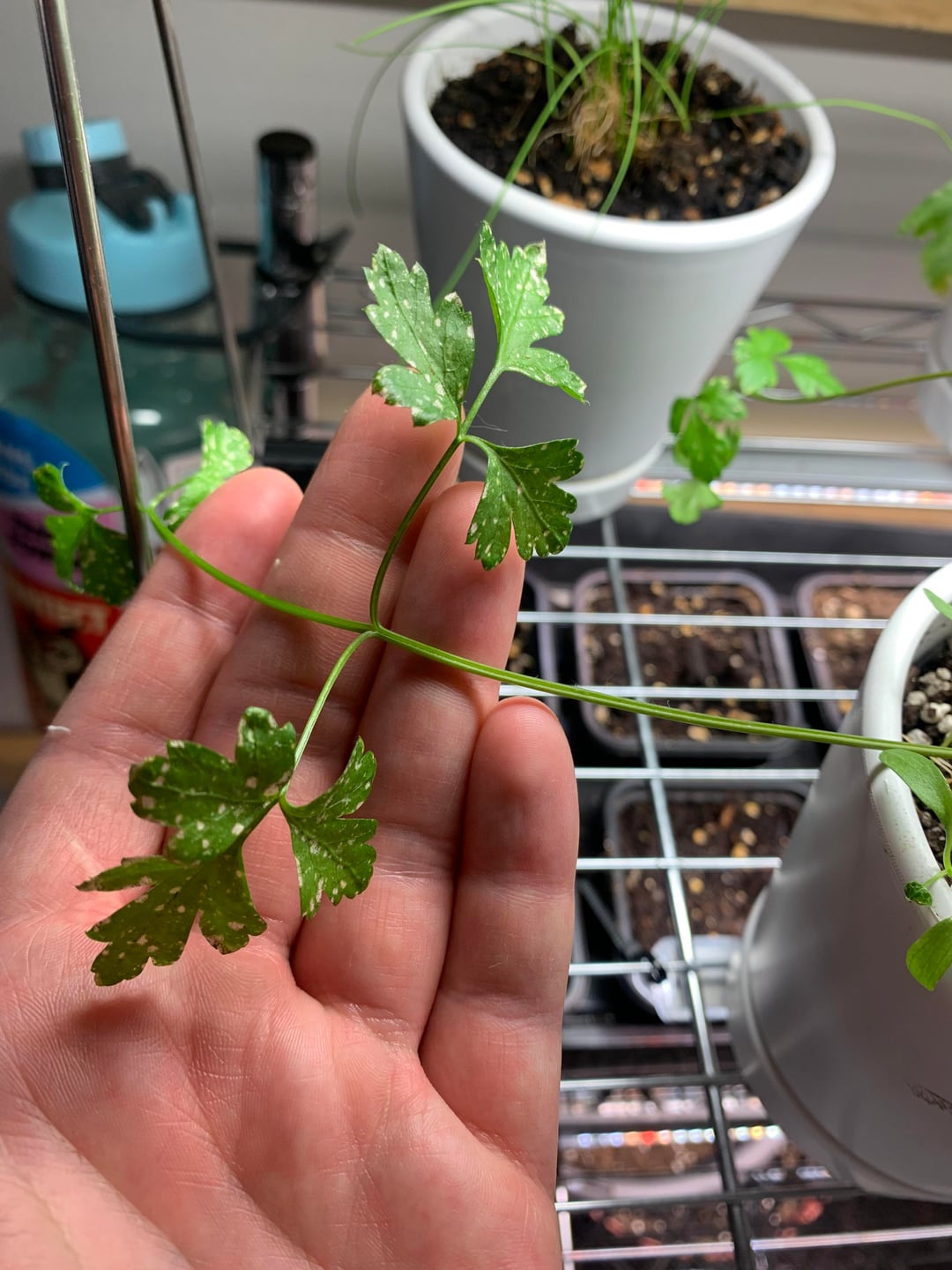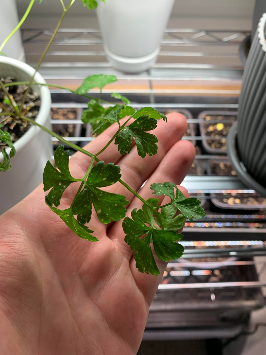 私のコリアンダーの植物の成熟した葉にはすべてこのような斑点があります。害虫やカビは見当たりません。最近セットアップを変更したので、照明が以前とは異なります。