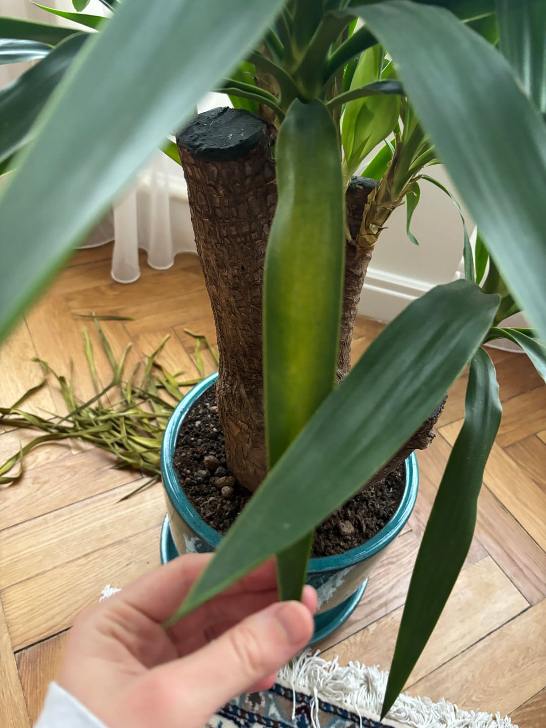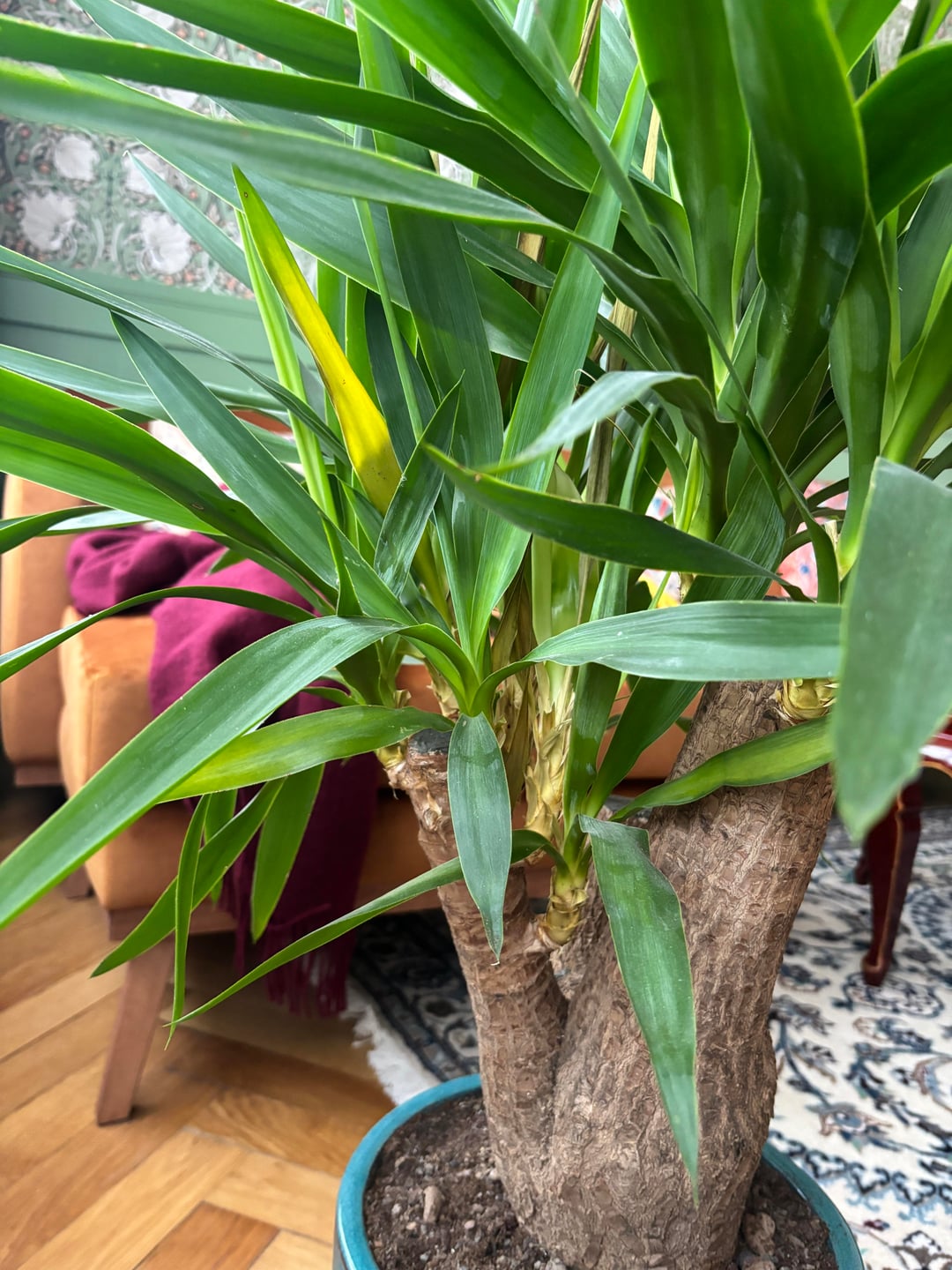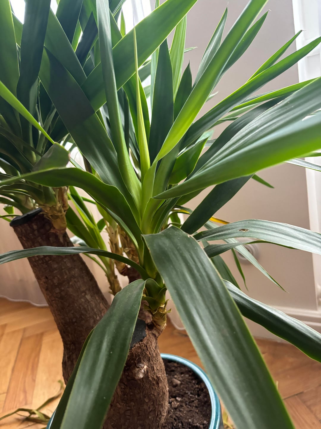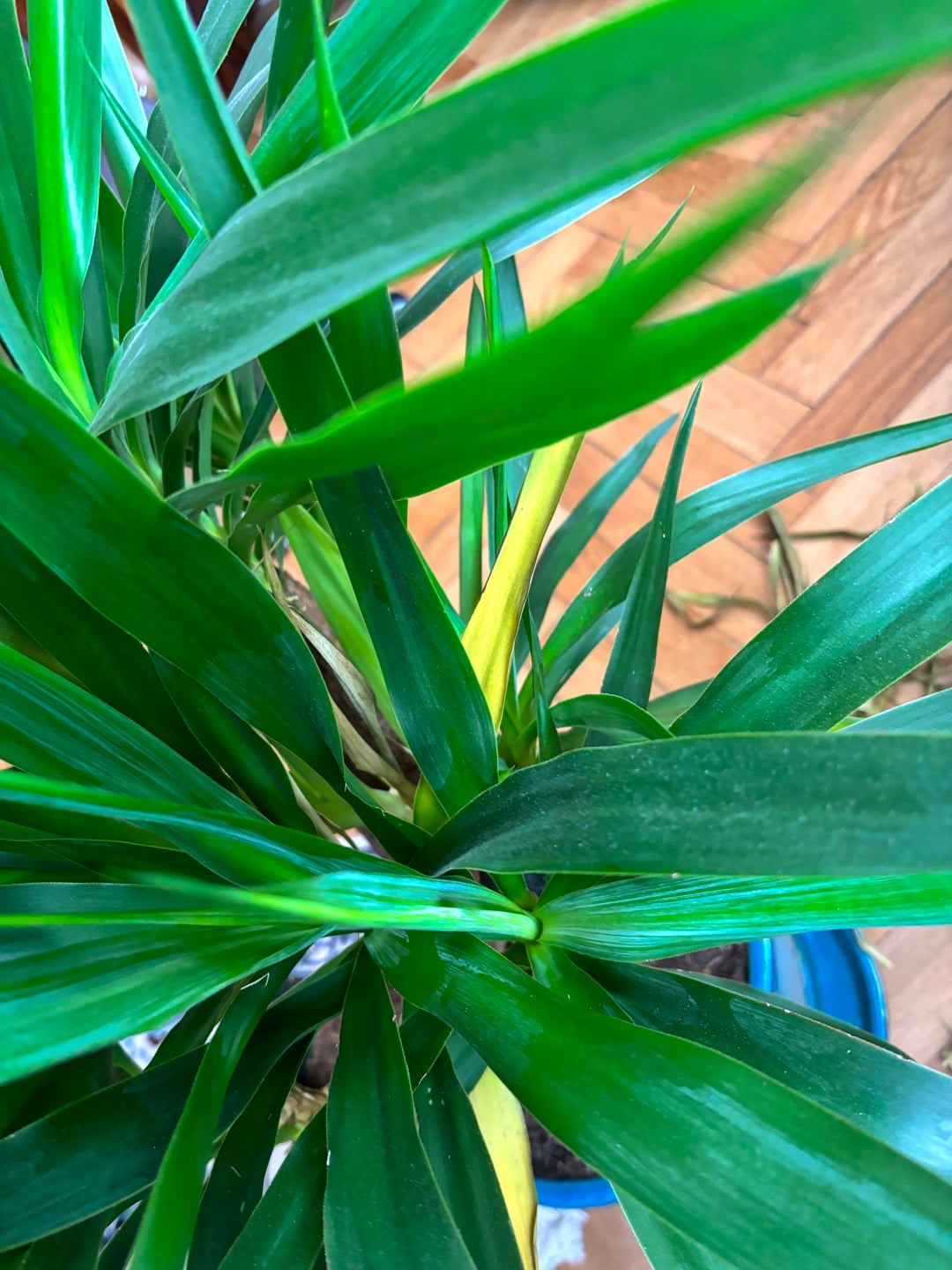 半年ほど前からこのユッカを育てているのですが、最近葉が黄色くなってきたのが気になり、枯れたものは切り取ったのですが、心配です。植物はまだ新しい葉を出しています。私は2週間に1回くらい、土に指を突っ込んで土が乾いていると感じたときに、かなりたっぷりと水やりをしています。植物の下には排水口のあるトレイがあります。助けてください!