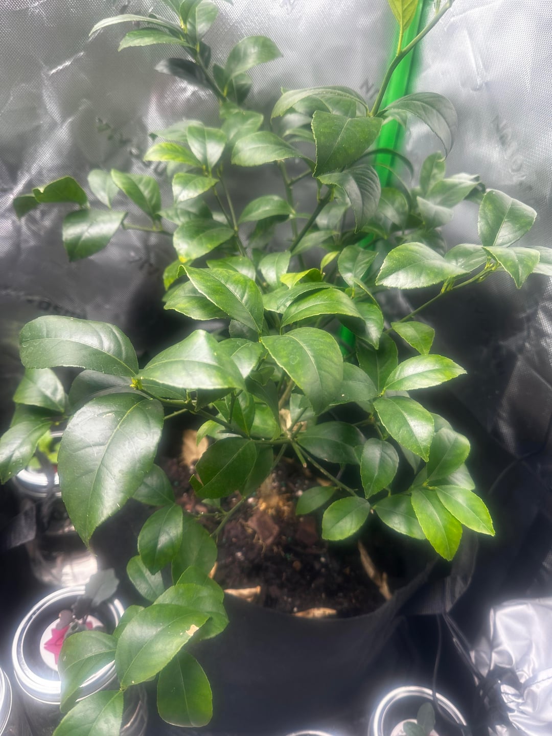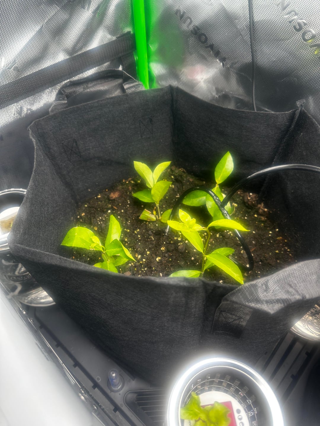繁栄させるために何をすべきかについてのヒントはありますか?それは、シトラスミラクルグロポッティングミックスの点滴散水システムを備えた栽培テント内にあり、芯水リザーバーの上に置かれた栽培バッグにも入っています。内部には 65 度に設定されたヒーター、換気扇システム、日周期の自動照明システムが備わっています。