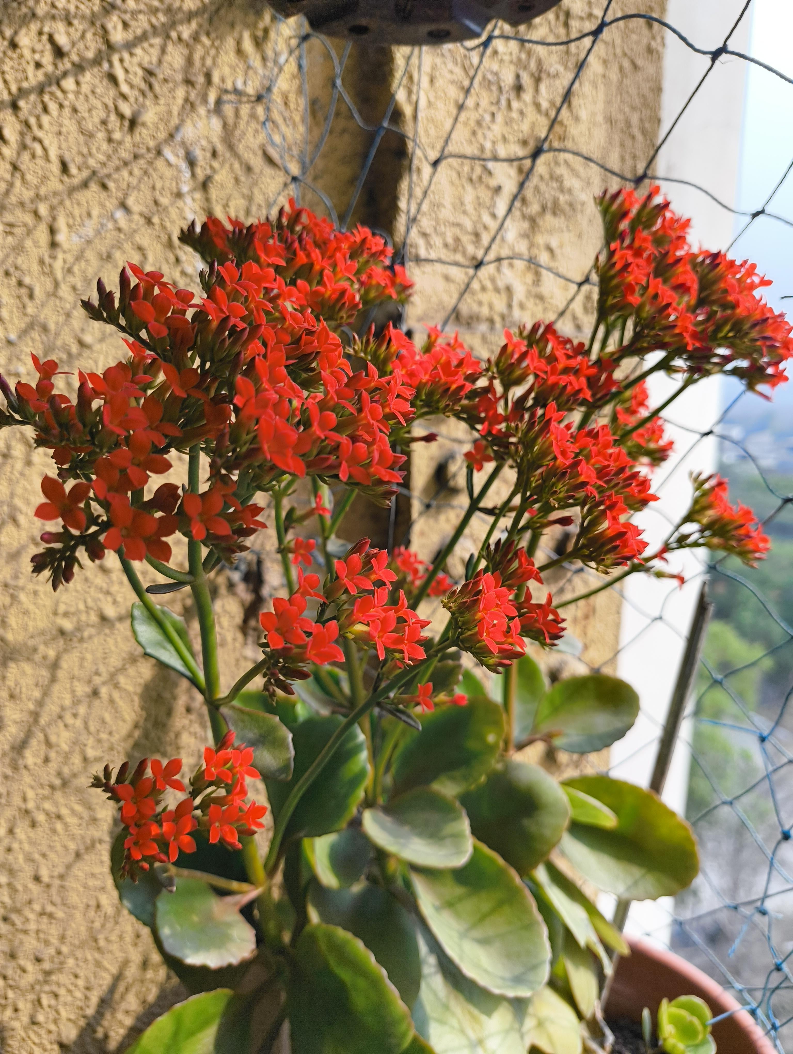 赤いカランコエが咲き、ピンクのカランコエが芽吹いています