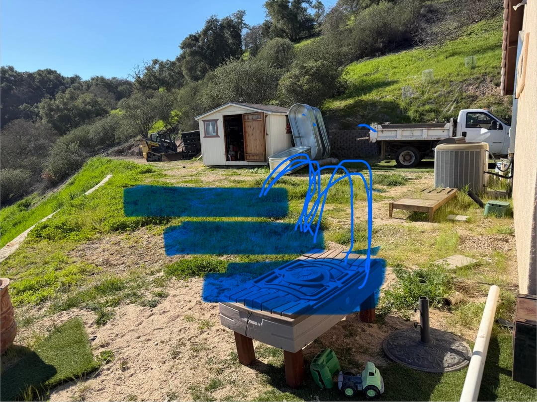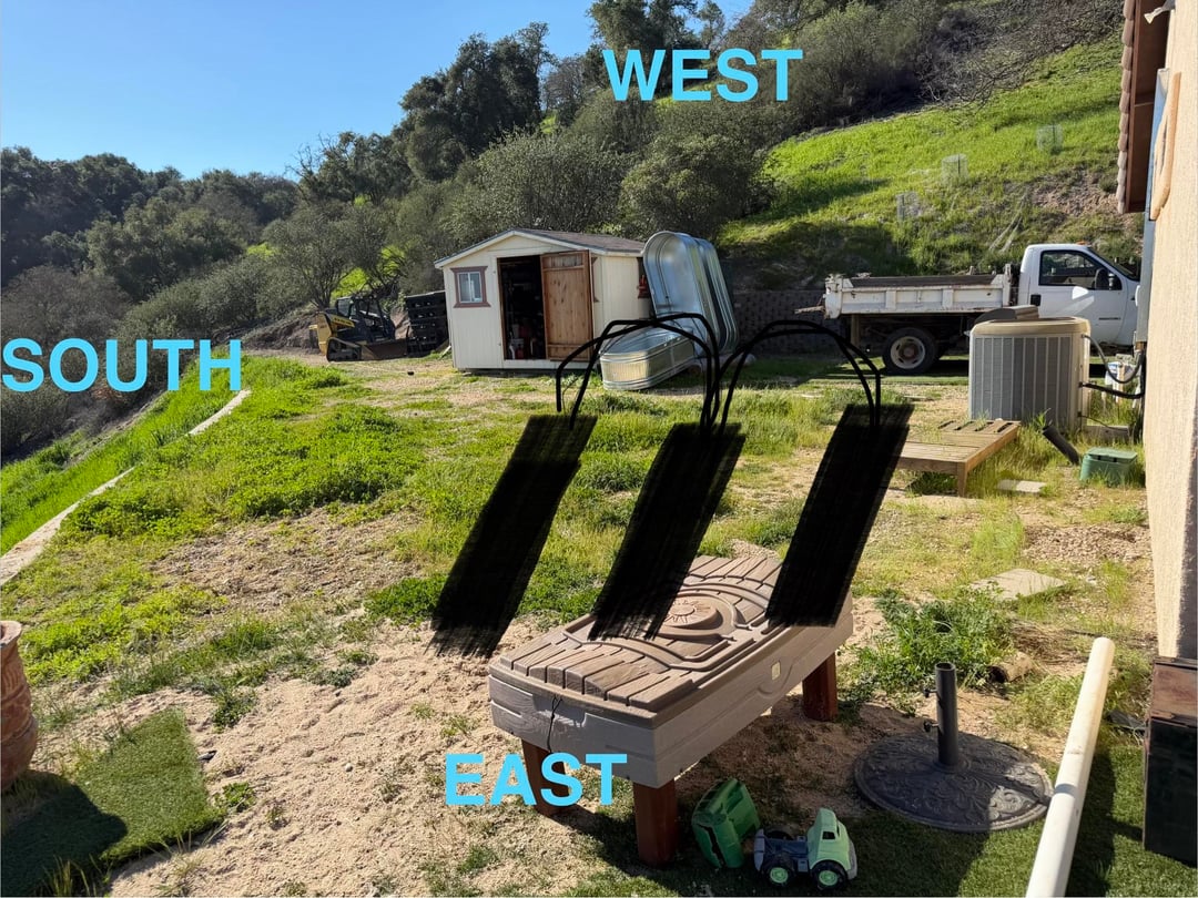 私たちはカリフォルニアのゾーン 9B で、敷地が南北に真っ直ぐに伸びています。私たちは丘の中腹にあるので、朝一番に太陽が当たります。このエリアは丘の頂上が日没を遮るまで太陽が当たります。つまり、夏は午前6時から午後6時まで太陽が当たります。かなり暑くなり、夏には100℃を超えることもあります。私たちはスカッシュを育ててスカッシュアーチをやりたいと考えているので、それがループです。この夏はトマト、ピーマン、キュウリ、ナスを育てたいと考えています。谷はこの写真の奥にあり、3x3x8 です。
