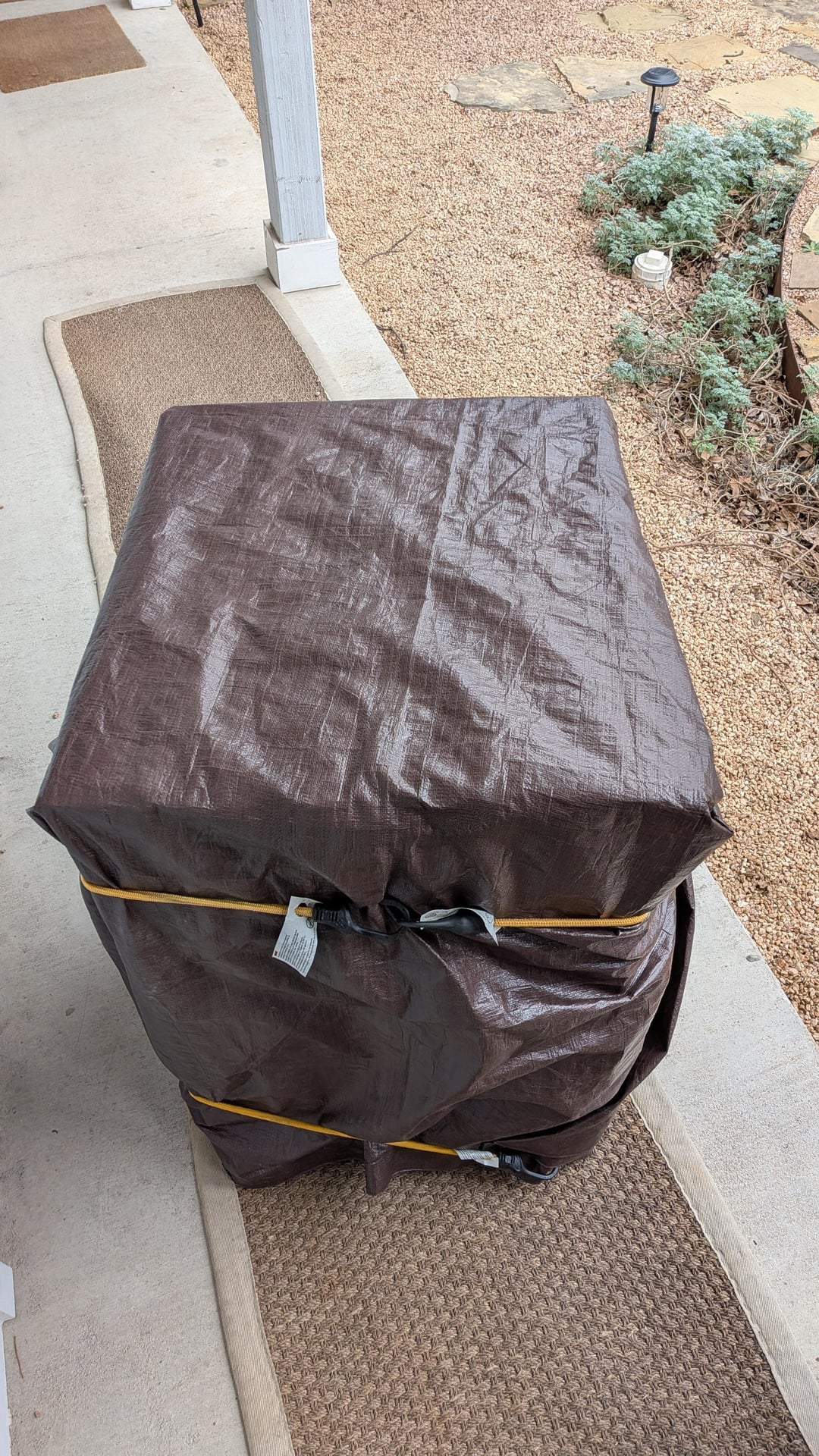 マクガイバーは誇りに思うだろう。ホームデポの特大引越しボックス。 8×4 シート 2 枚 1 枚" 厚さ3mの発泡断熱材。防水シート。ダクトテープとバンジーコード(マクガイバーだから)。