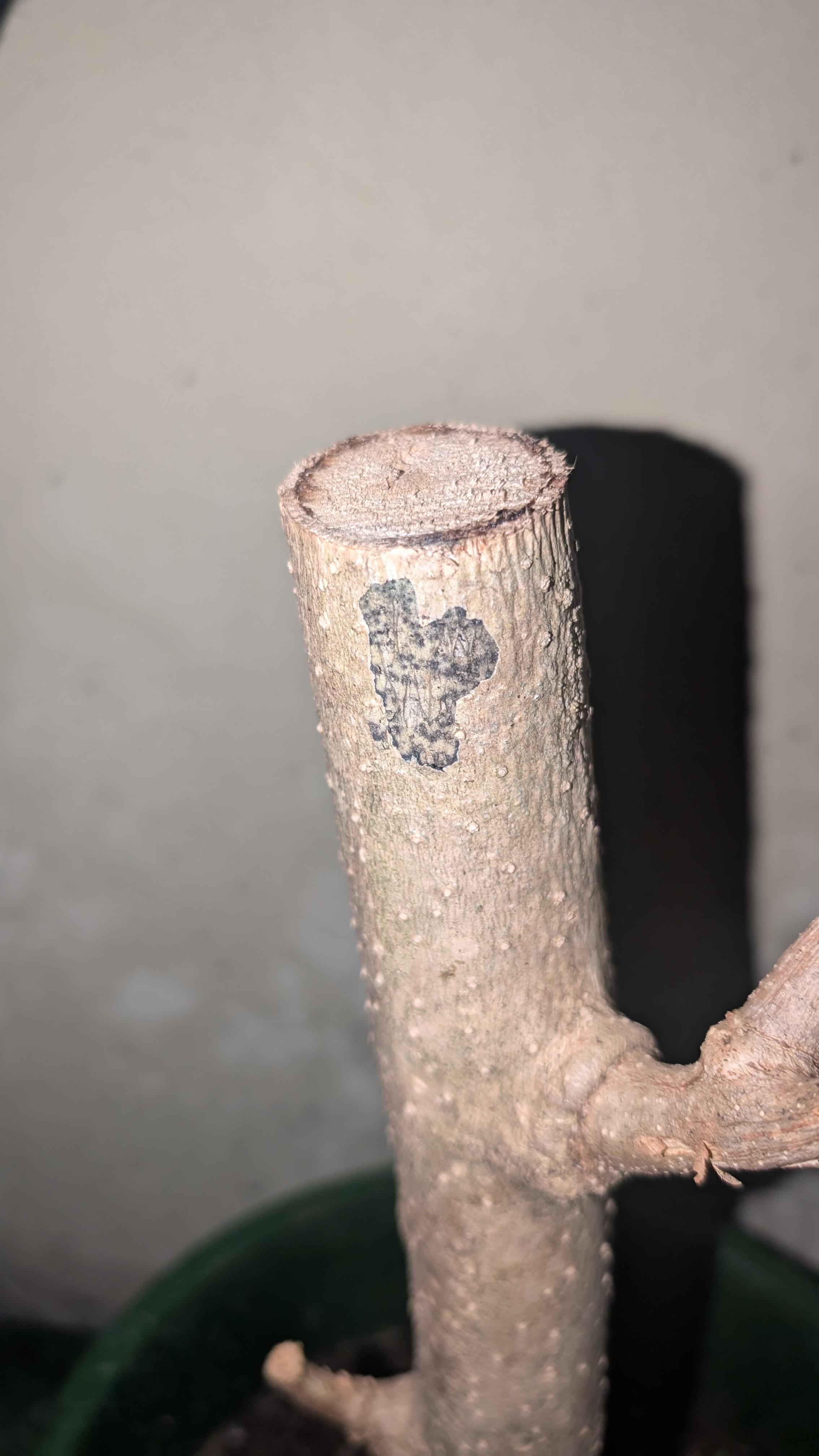 最近、1か月ほど前に、祖父母がモリンガの挿し木(古いモリンガの幹から取ってきたものだと思う?)をくれたのですが、最近、樹皮を切ろうとしたときに、挿し木の上部が乾燥して黒い斑点があることに気づきました。これらはカビですか?下の部分を切ってみましたが、まだ緑色ですが、樹皮を切った場所の近くで古い枝の一部が枯れてしまったようです。