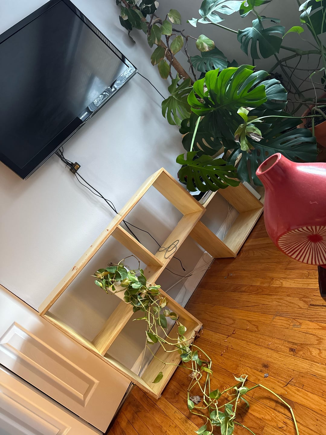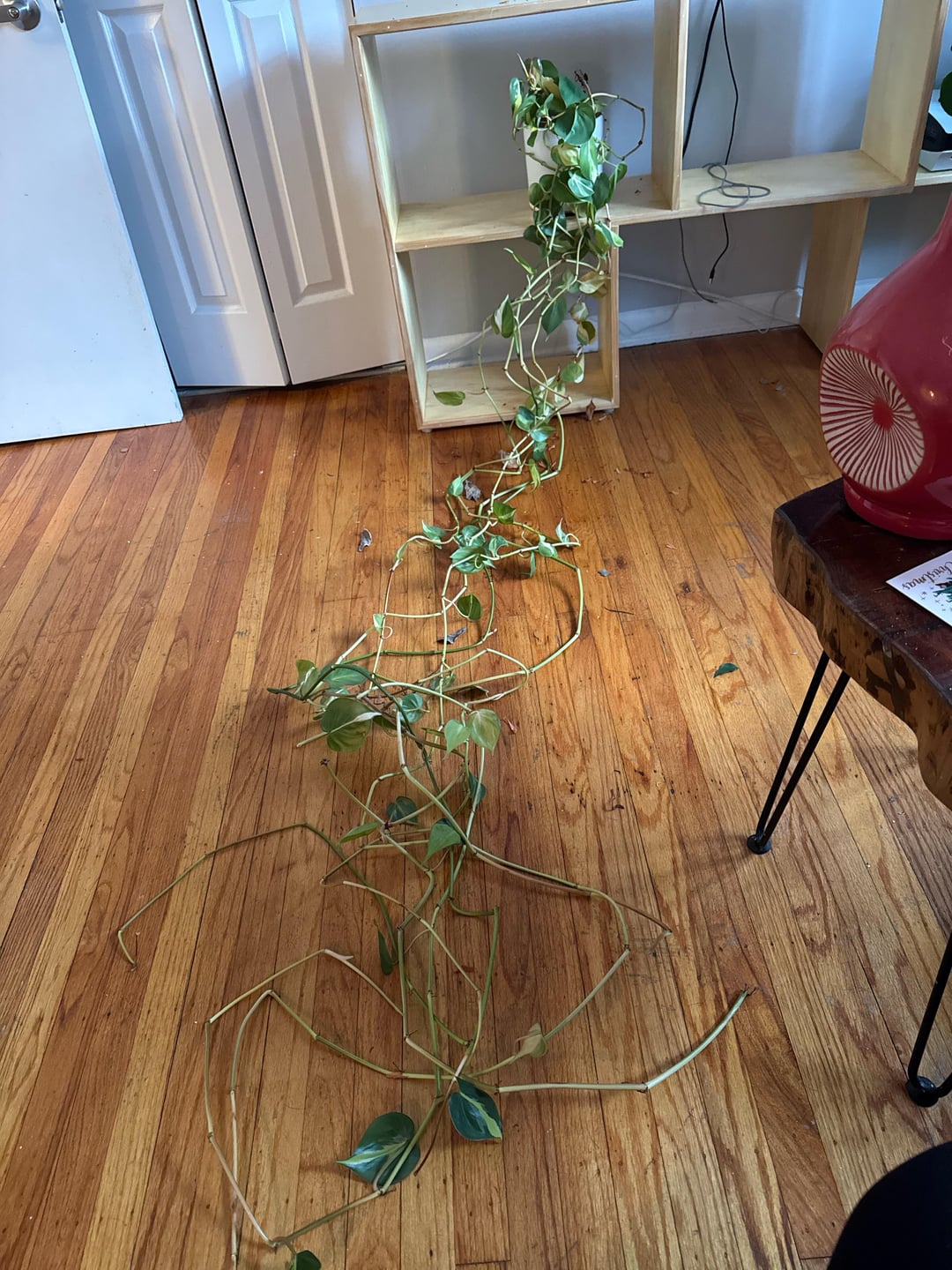 新しい本棚を手に入れたので、ブラジリアン ポトスをなんとか棚に並べたいと思っていますが、このクレイジーに長い蔓に苦労しています。後ろにどのようにカットする必要がありますか、それとも乱雑に/クレイジーに見えずにそれを収める方法はありますか?棚の周りに巻き付けようとしましたが、それはちょっと失敗です。アドバイスは大歓迎です!