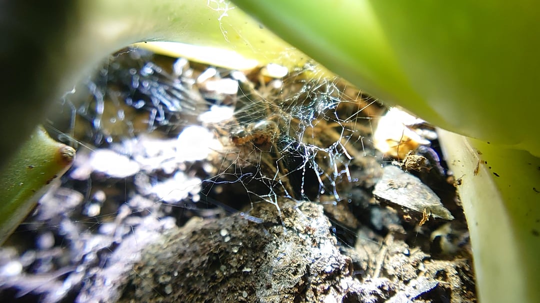 3日前、多肉植物の鉢に巣があることに気づきました。最初に考えたのはハダニでしたが、見つかりませんでした。 "ダニ"。ウェブをブラッシングしてきれいにしただけです。今は巣が戻ってきて、クモを見つけました。 (写真のクモの巣を強調するために少し霧を吹きました)。