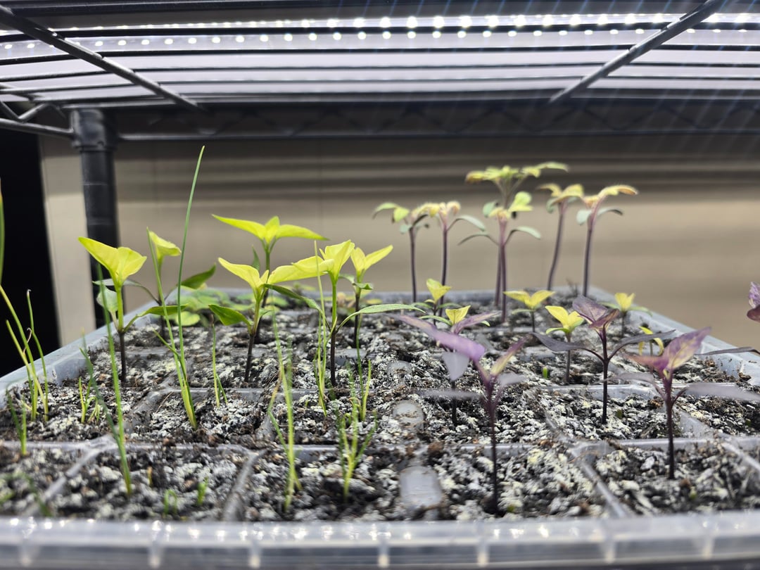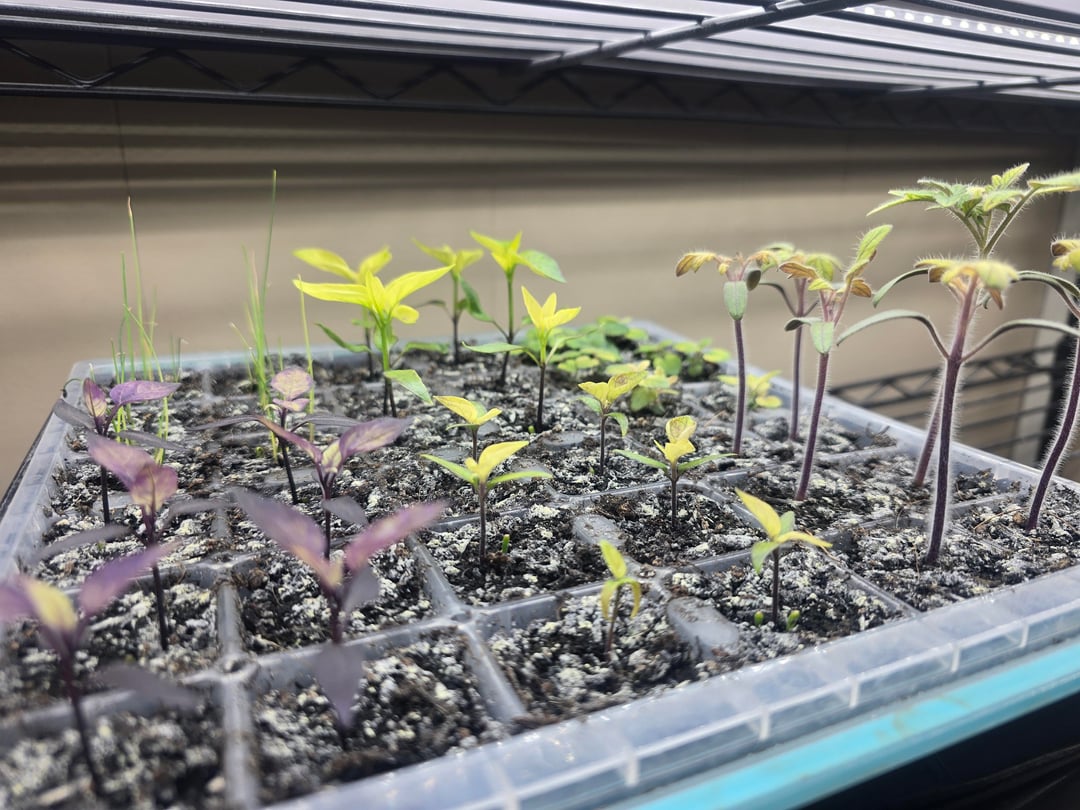 このトレイの苗木はすべて黄色くなり始めています。安定した光を持っていますが、LEDショップライトであり、栽培用ライトではありません。底トレイが乾いてから1日後に底水をやります。非常に薄めの肥料を2回与えました。 1日に数時間稼働するファンがあります。どうやら彼らも成長が止まっているようだ。