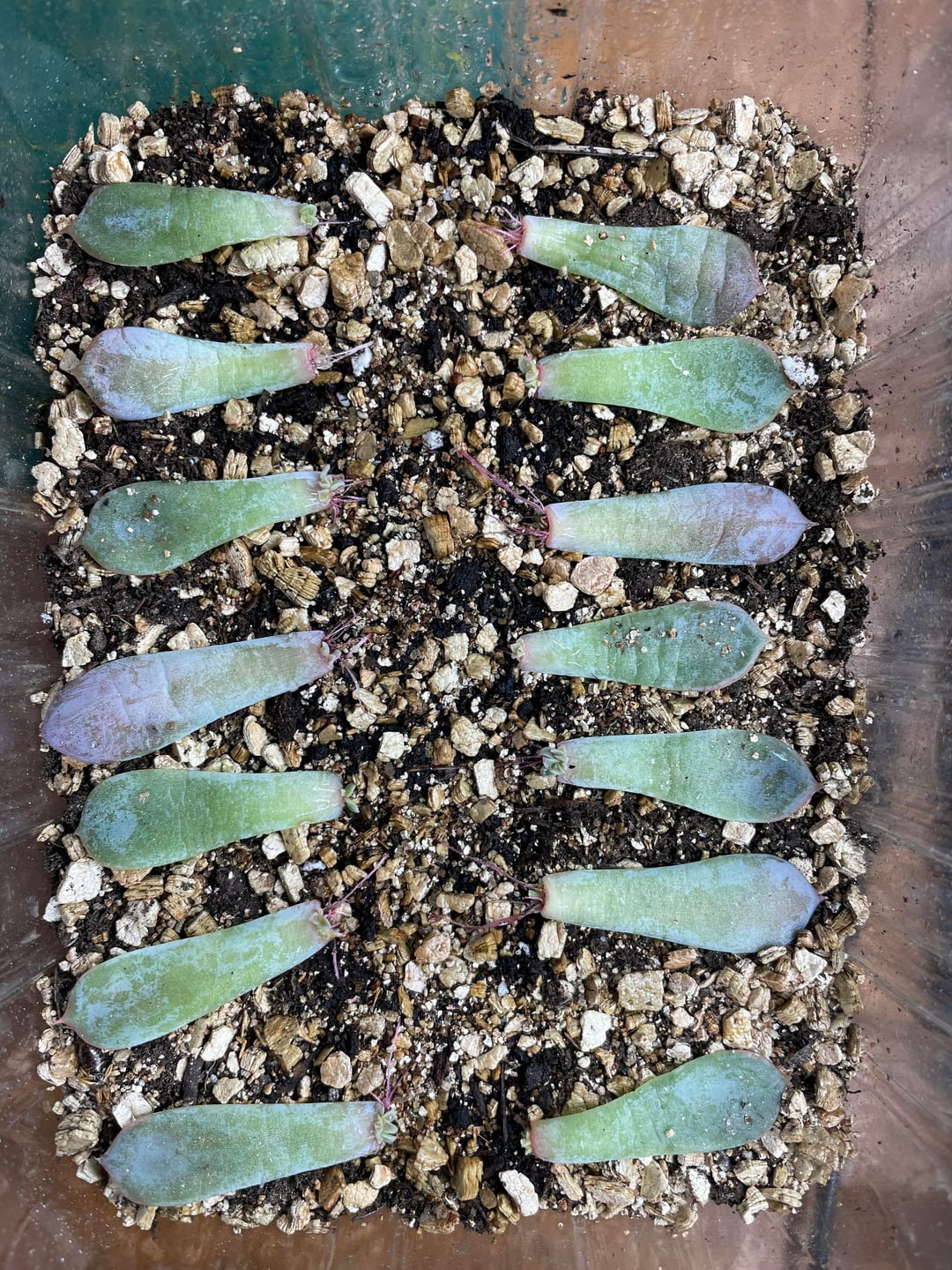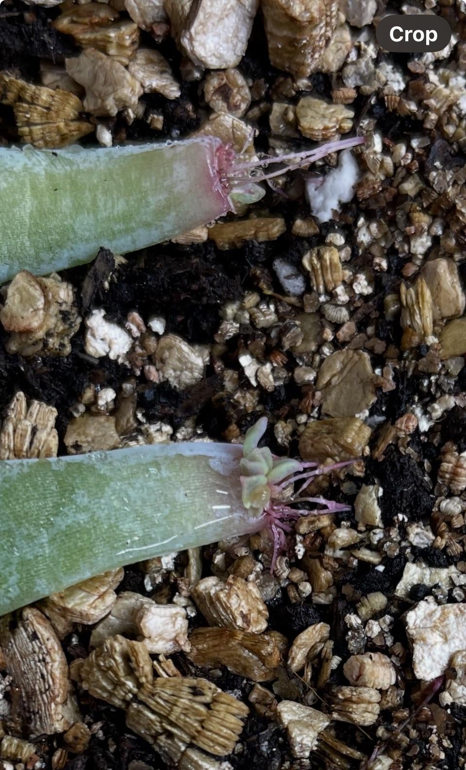 ゆっくりですが、端のかさぶたをかさぶたにして、バーミキュライトと培養土を混ぜたものに置くと、根と葉が見え始めました。 3週間は続くはずだ。何かを書き留め始めなければなりません。