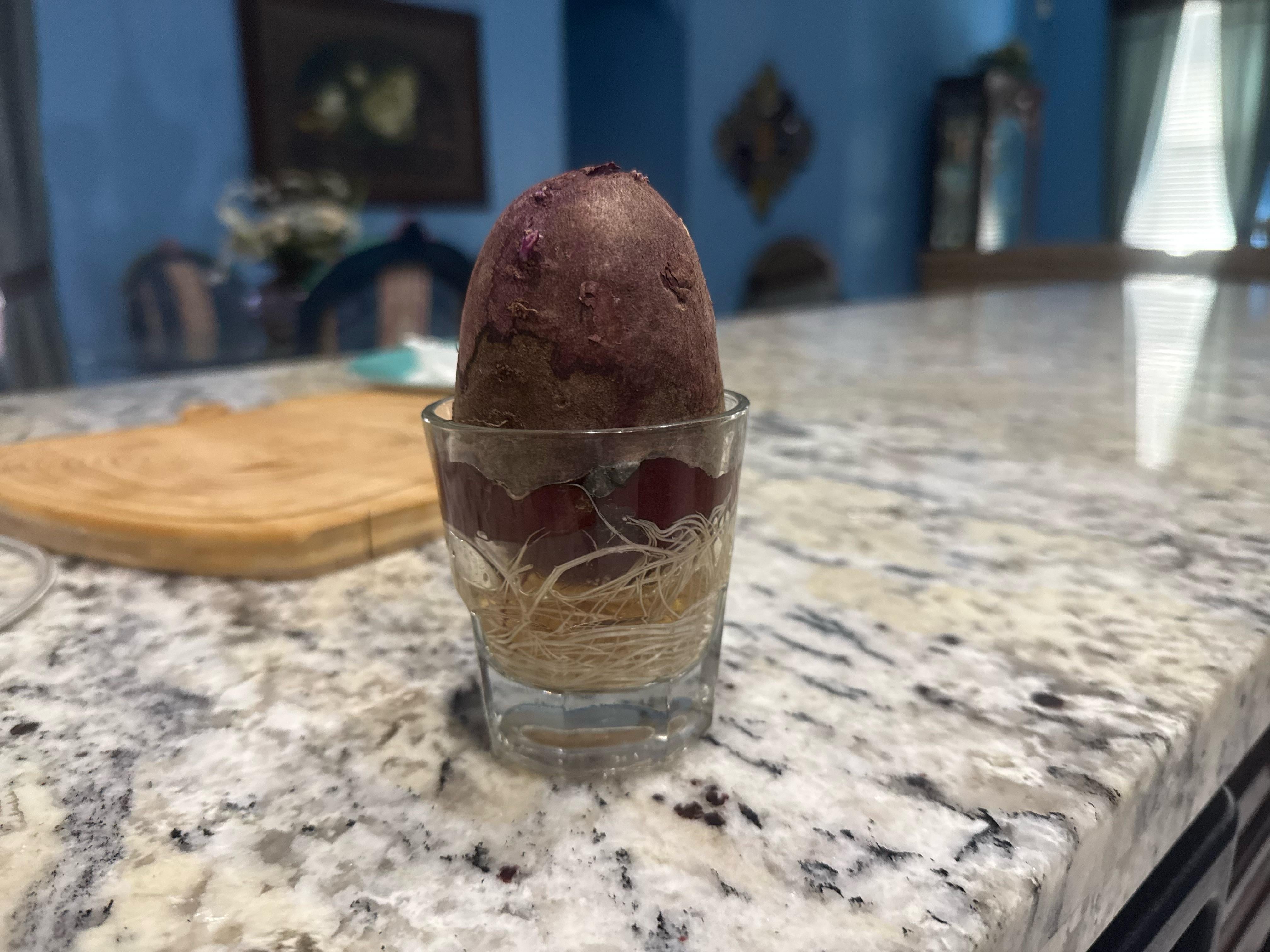 このジャガイモを水に挿して根を伸ばしたのですが、今度は…。どうすればいいのかわかりません!地植えにするのか、それとも水中に置いておくのか?できれば大きめの容器に移してみます。