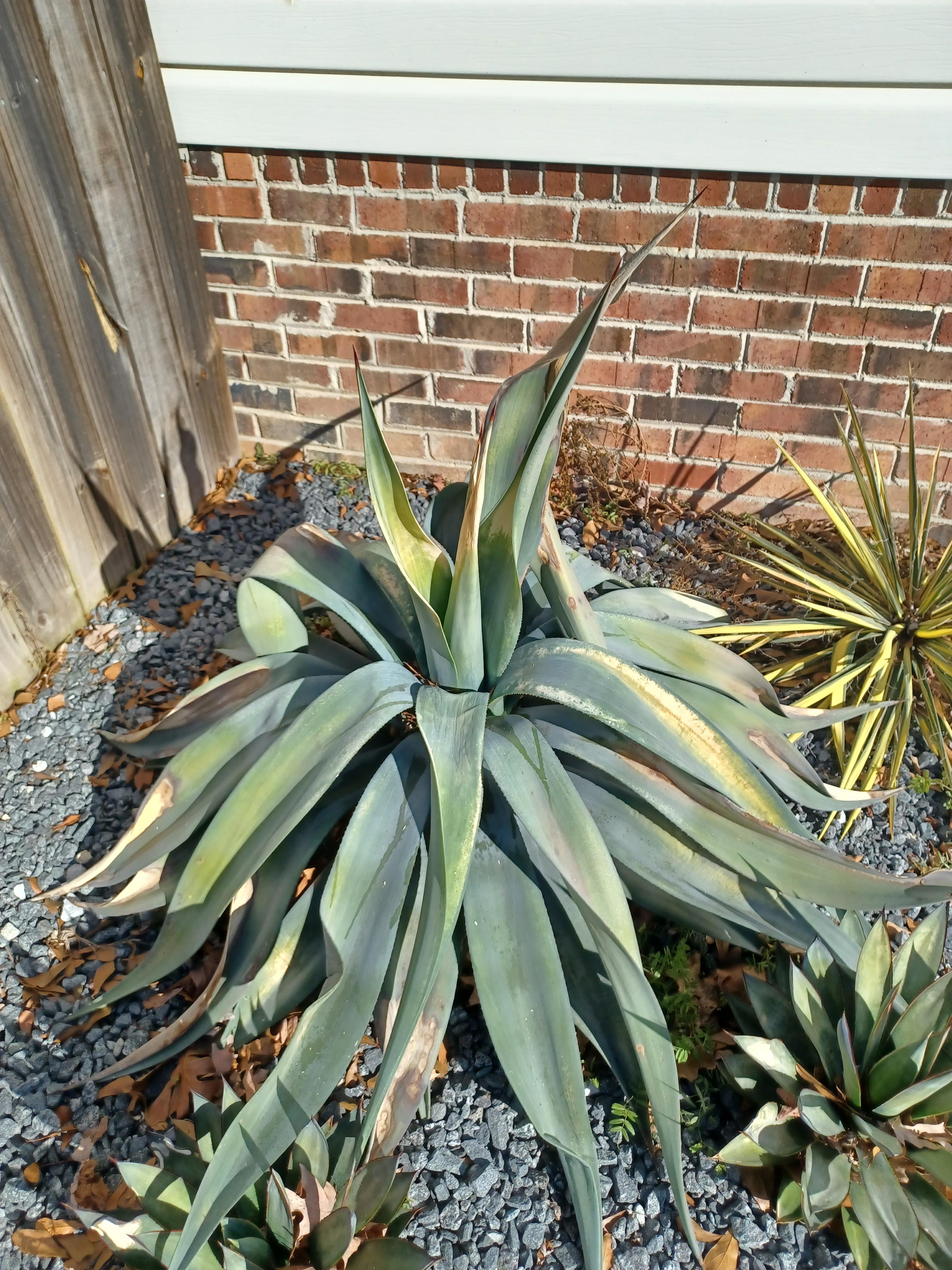 ゾーン 8A… このリュウゼツランを昨年地元で購入し、家の南側、スプリンクラーの影響を受けない小さな多肉植物のベッドに、太陽がよく当たる場所に植えました。夏の間、それは今の場所が気に入ったようで、驚くほど早く成長しました。しかし、秋以降、だんだんと見た目が悪くなってきました。この辺りには他にもリュウゼツランを育てている人がたくさんいて、彼らの植物は元気に育っているようだ。 これはすでに使い古されていると思いますが、この春に交換する場合はどうすればよいですか?