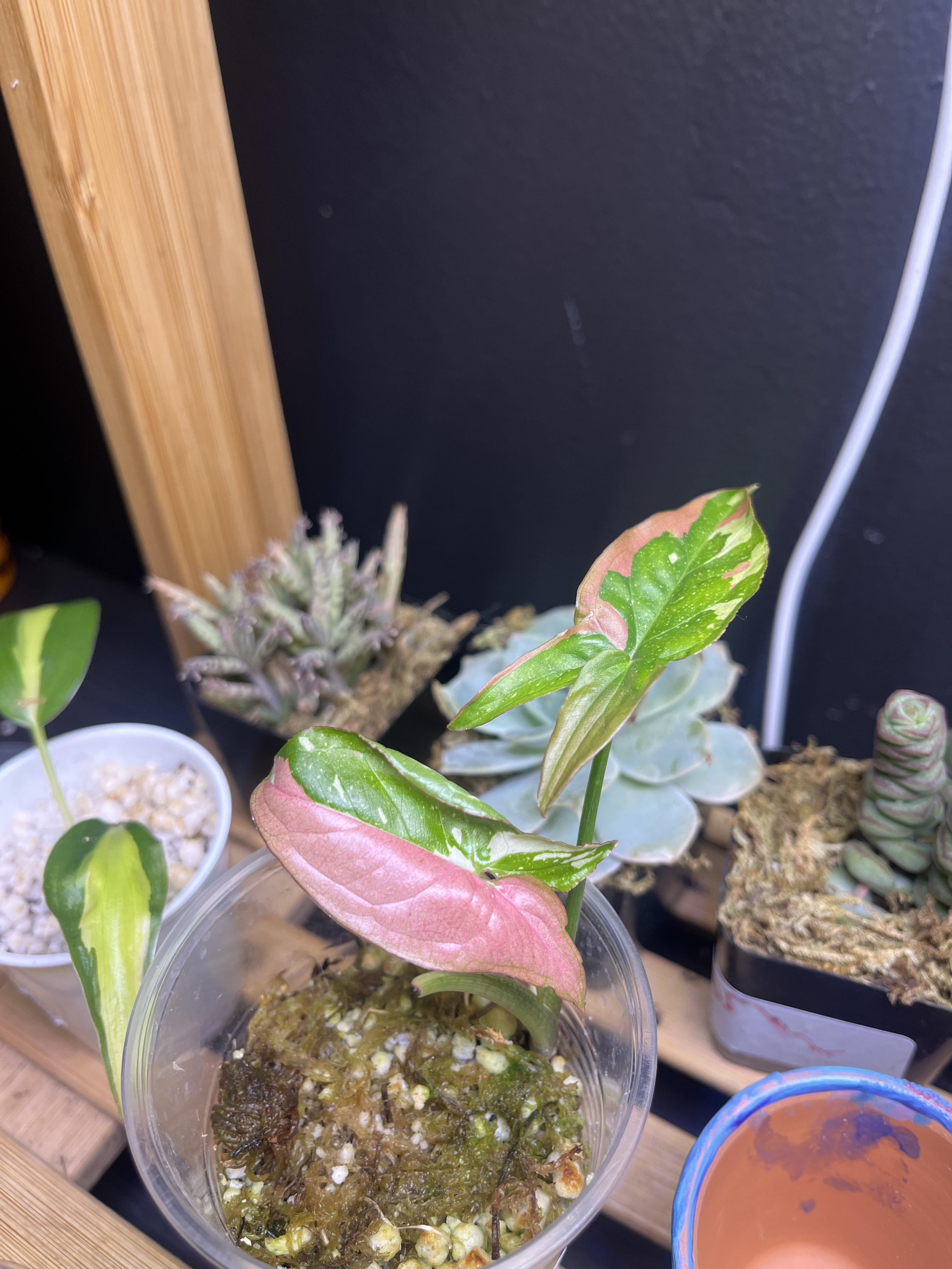 この小さな赤ちゃんの赤い斑点のあるトリコロールシンゴニウムは、葉が折れ、垂れ下がった状態で冷たく届きました。少しの愛、水、光、そして時間。そしてみんな、その二枚目の葉を見てください!!写真を撮るのが待ちきれませんでした(笑)私たちはこれにとても一生懸命取り組みました!!