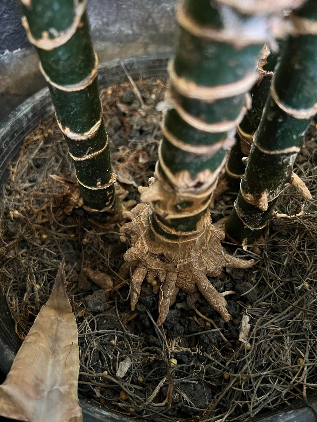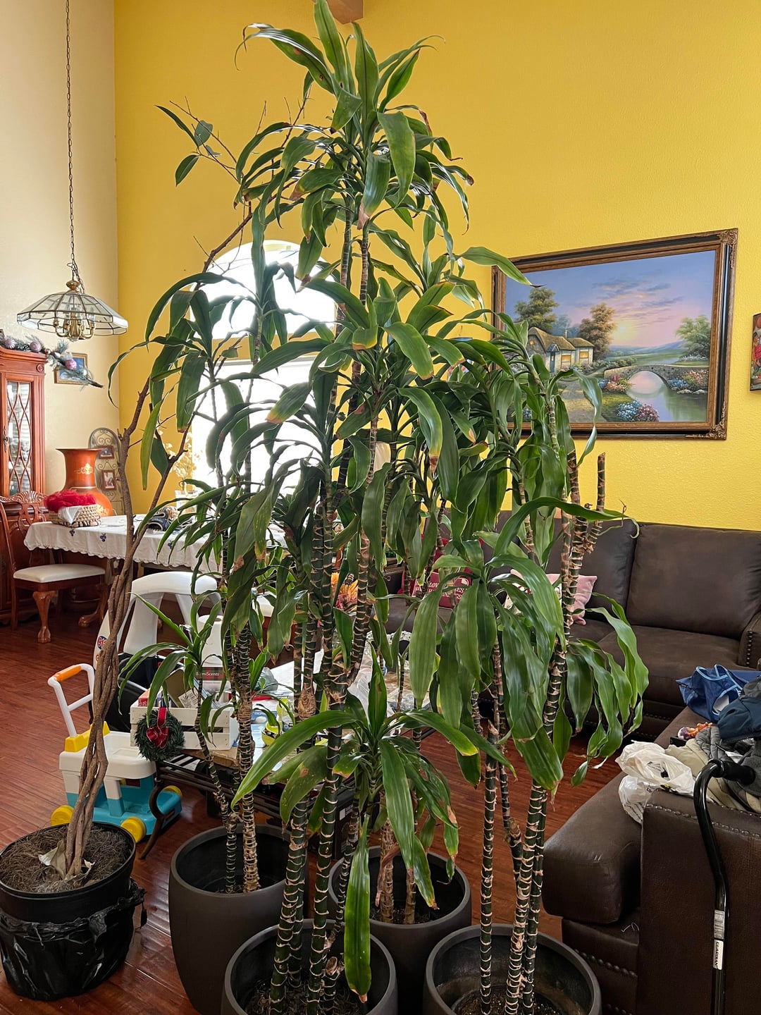 ドラセノアファミリーなのでしょうか?彼らはかなり健康そうに見えます。ほとんど先端が茶色になり、いくつかの茎が折れて倒れていました。茶色い部分を切り落とし、折れた茎をきれいに切り落としました。すべてが根に縛られているように見えますが、1つのポットに茎が多すぎると主張する人もいるかもしれません。