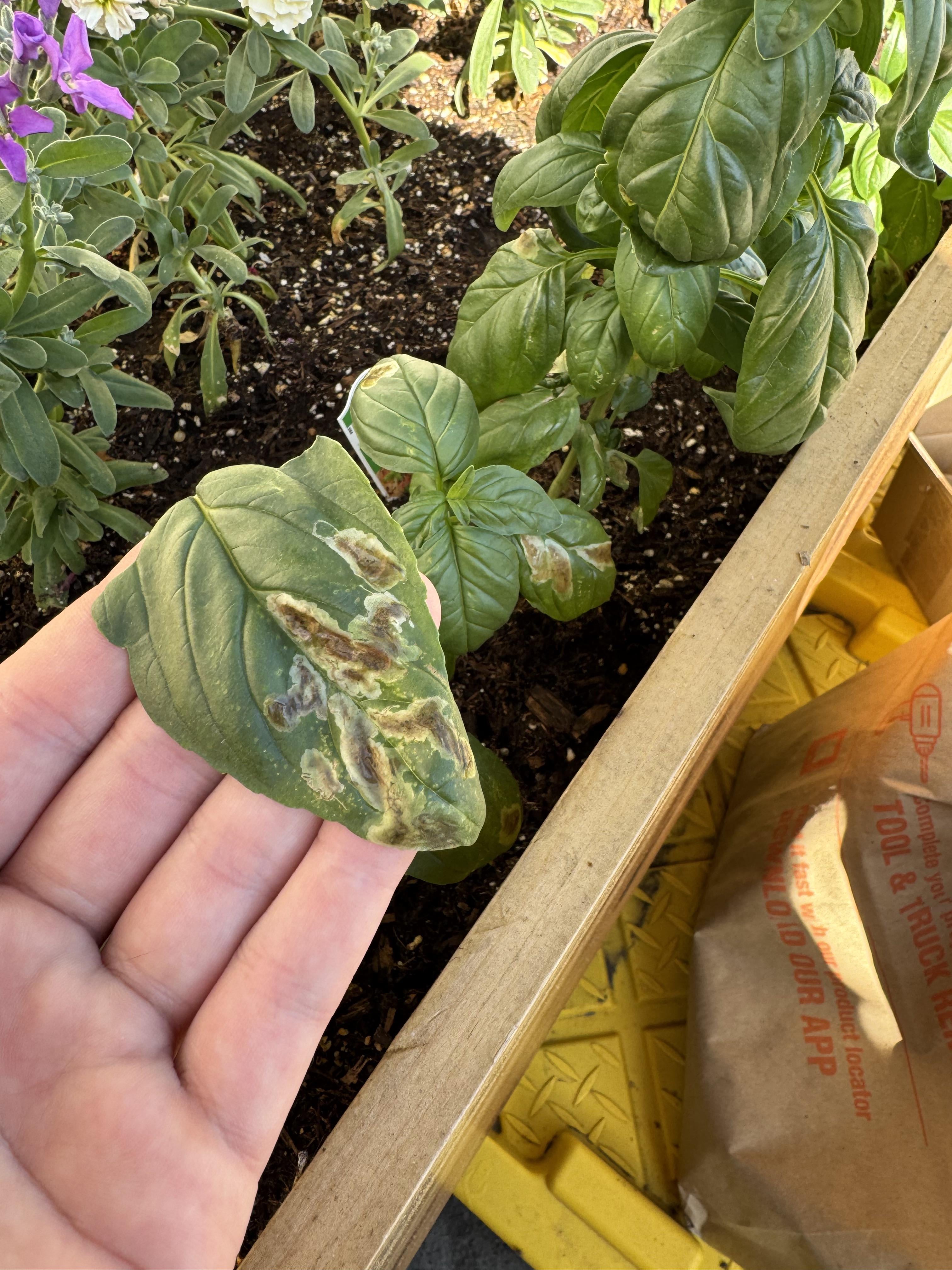このスイートバジルの問題を診断するために、私は栽培を始めました (SoCal)。直射日光がたくさんあるので、カビではなくそれが問題だと思います。何かヒントはありますか、それとも感染をさらに拡大させる可能性はありますか?