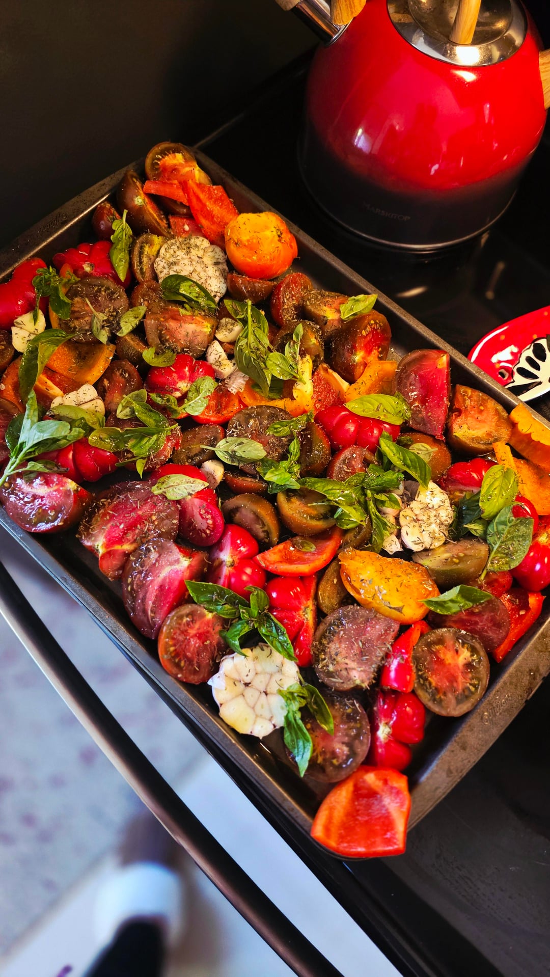 自家製ニンニク、バジル、カラフルトマト、レインボーキャロットたっぷり