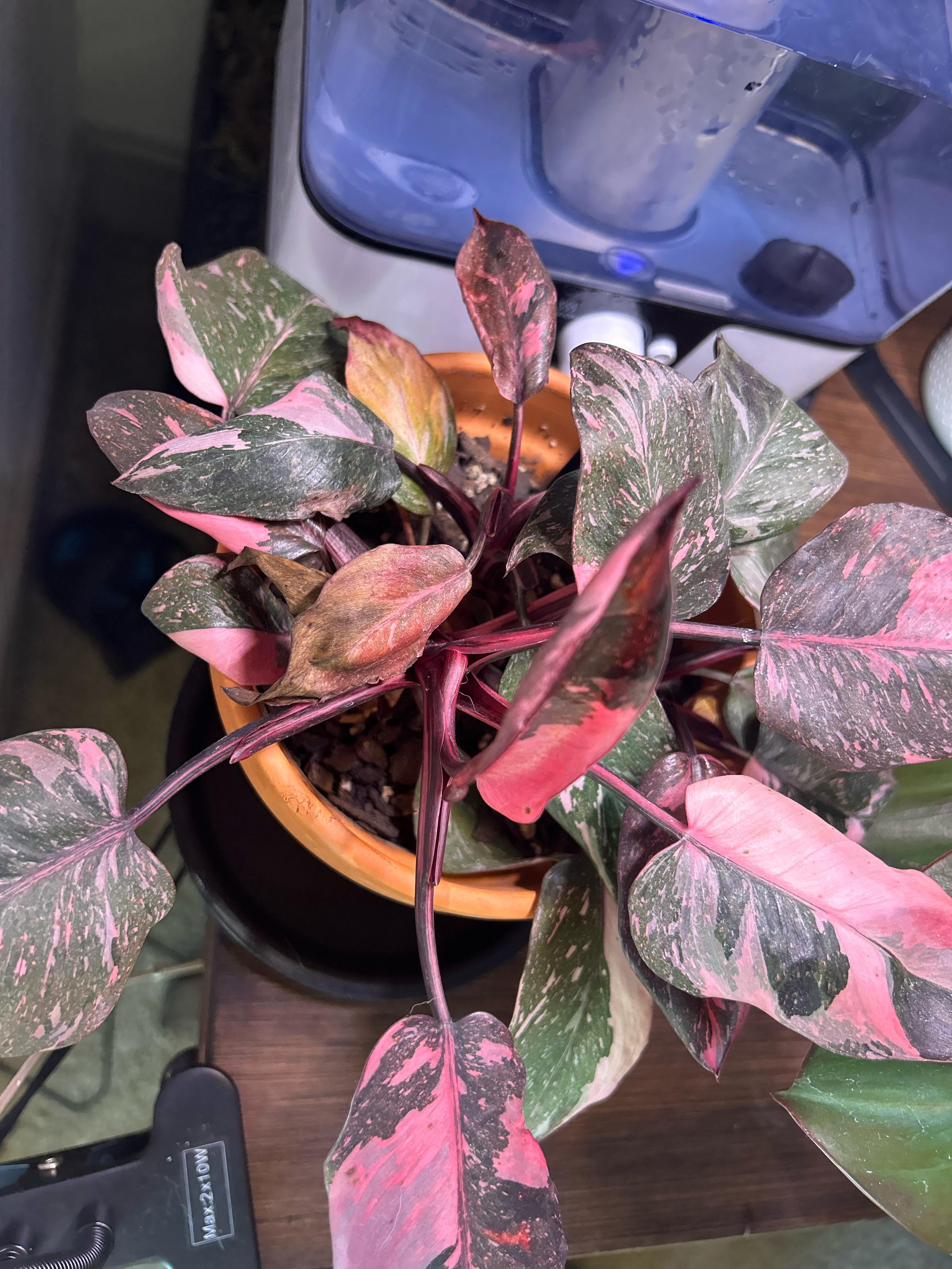 一部の葉が茶色/黄色くなっています。水のやりすぎではないと思います。7日ほどでほぼ完全に乾いてしまうので、10日おきに水をあげています。 加湿器の隣にあるのですが、光が強すぎたのかもしれないので、育成ライトを少し離れたところに移動しました。 ありがとう