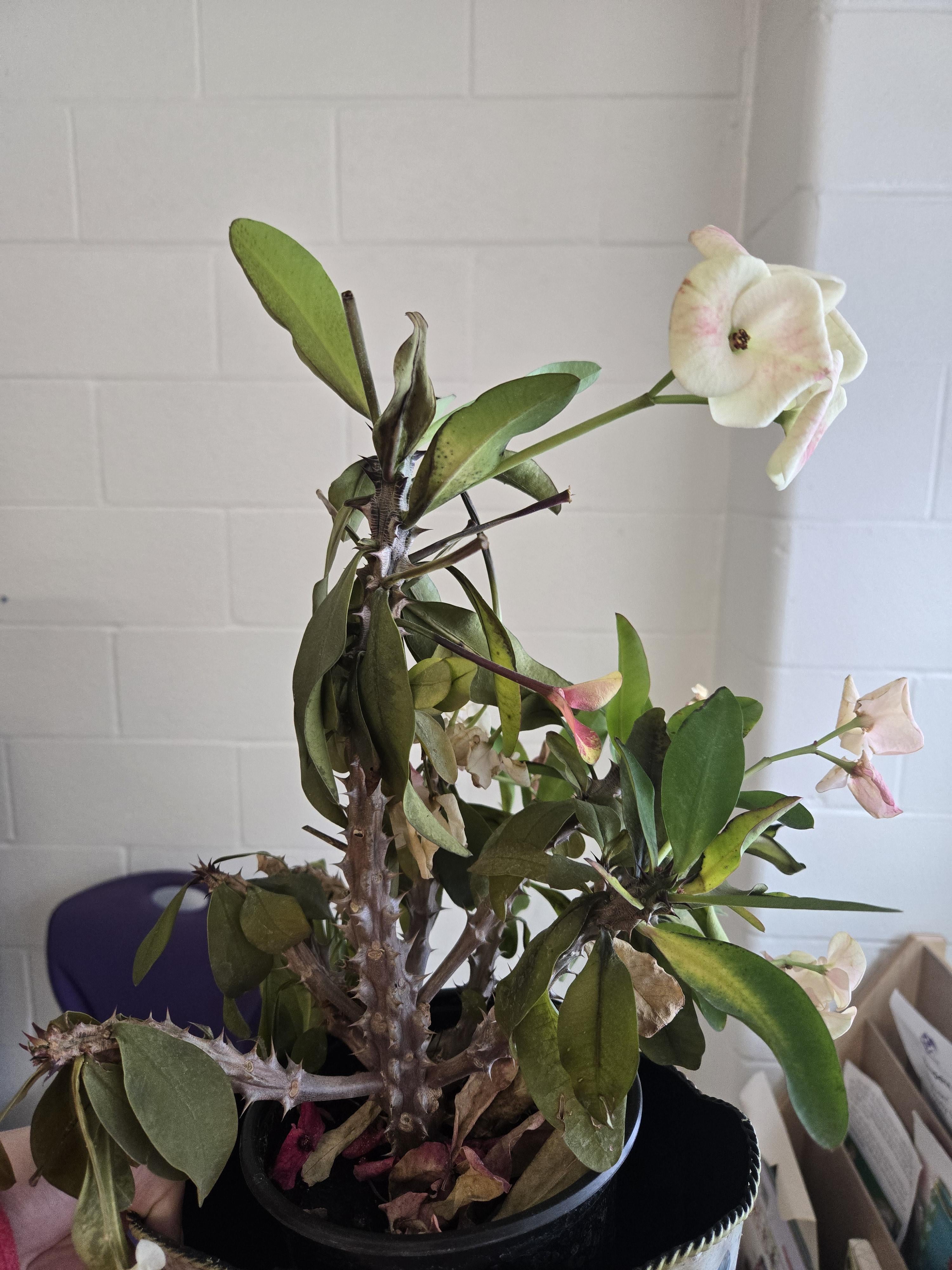 これは祖母が亡くなったときに譲り受けたものです。教室の南向きの窓際に置いてあります(建物で日差しが遮られていますが、明るいです)。窓の下にはヒーターがあり、土は湿っています。最初の 1 か月は素晴らしかったですが、このようになり始めています。アドバイスはありますか?