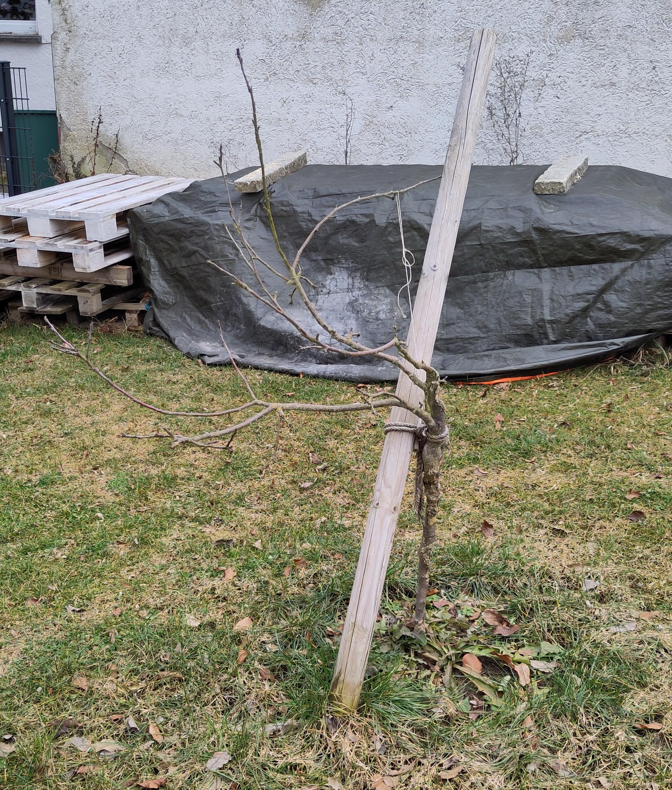 私たちはこのリンゴの木を数年前に手に入れました。残念なことに、鉢の中で頻繁に動かしたため、かなり痛めつけられました。昨年、ようやく新しい庭に植えることができました。主枝を含むすべての枝を失ったため、非常にサイドヘビーです。いつか木のバランスが取れるようにと、残った枝を北に向けて植えました。今度は、新しい枝が伸びるきっかけとなるように伐採しようと考えています。できれば中心部に近いと思います。どう思いますか?どこを切ればいいのでしょうか?
