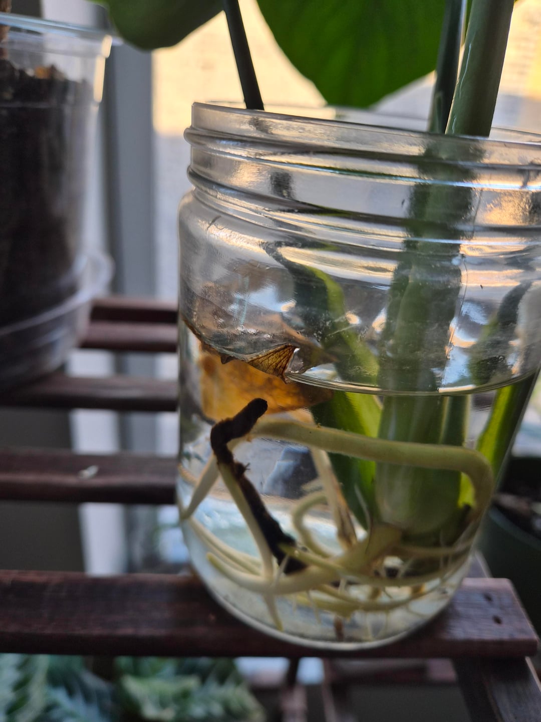 クリスマスの頃からこのモンステラの挿し木を育てていて、パトスの挿し木と一緒に瓶に入れました。彼女は土を食べる準備ができていますか、それとも彼女に料理を続けさせるべきでしょうか?