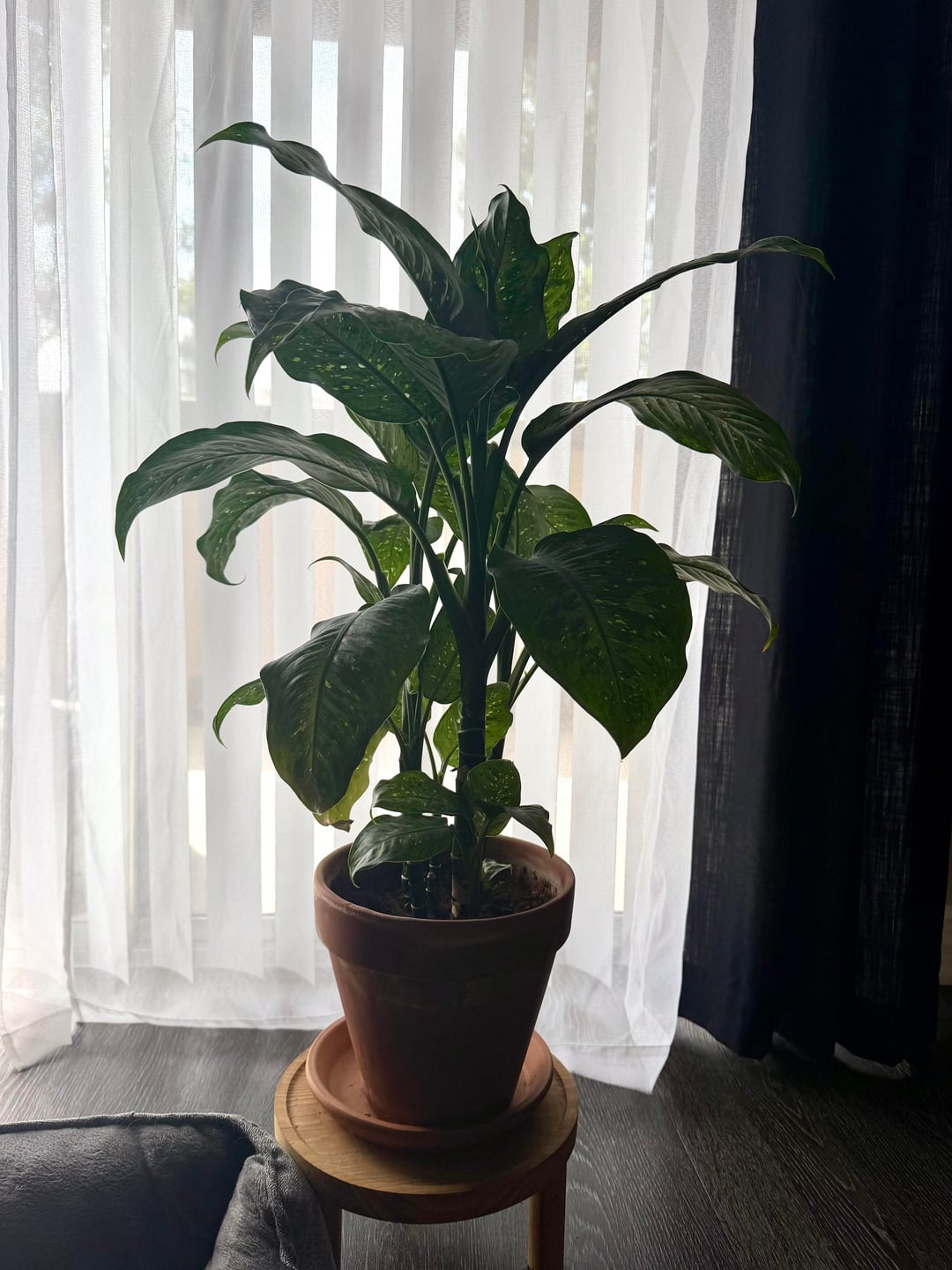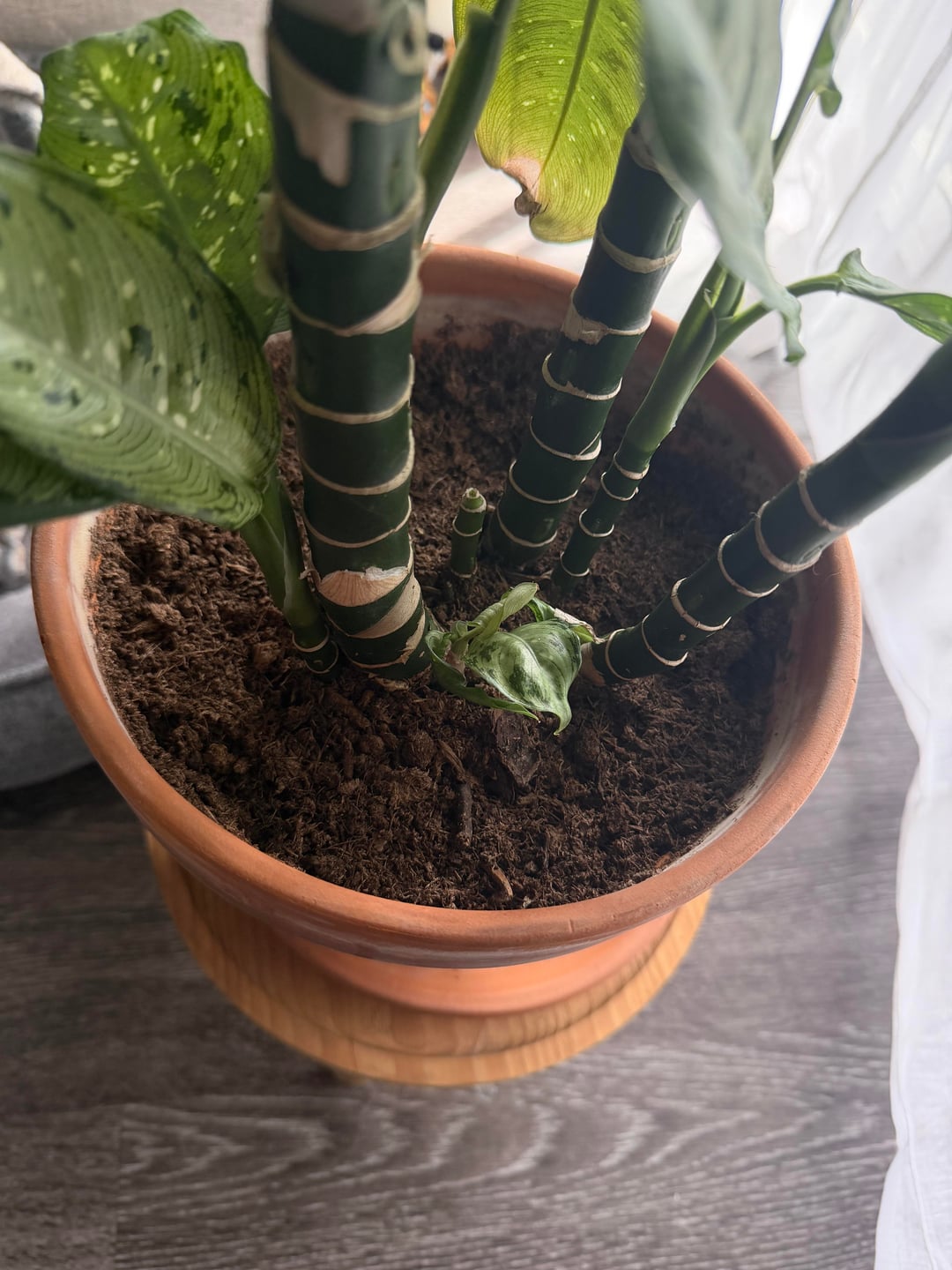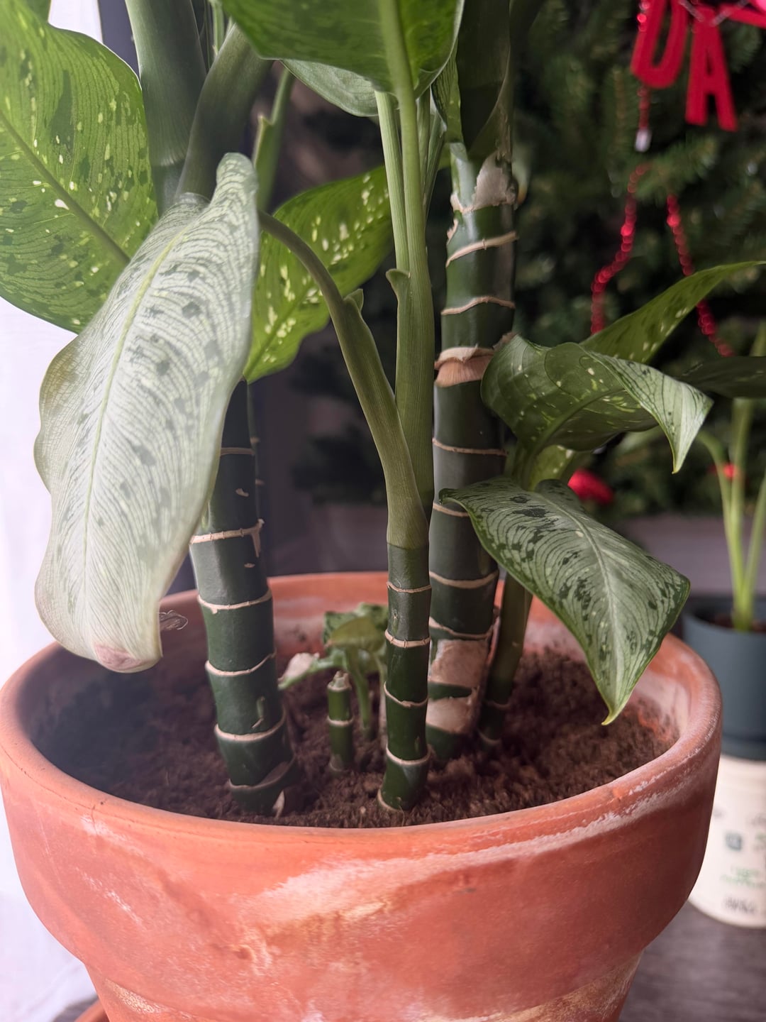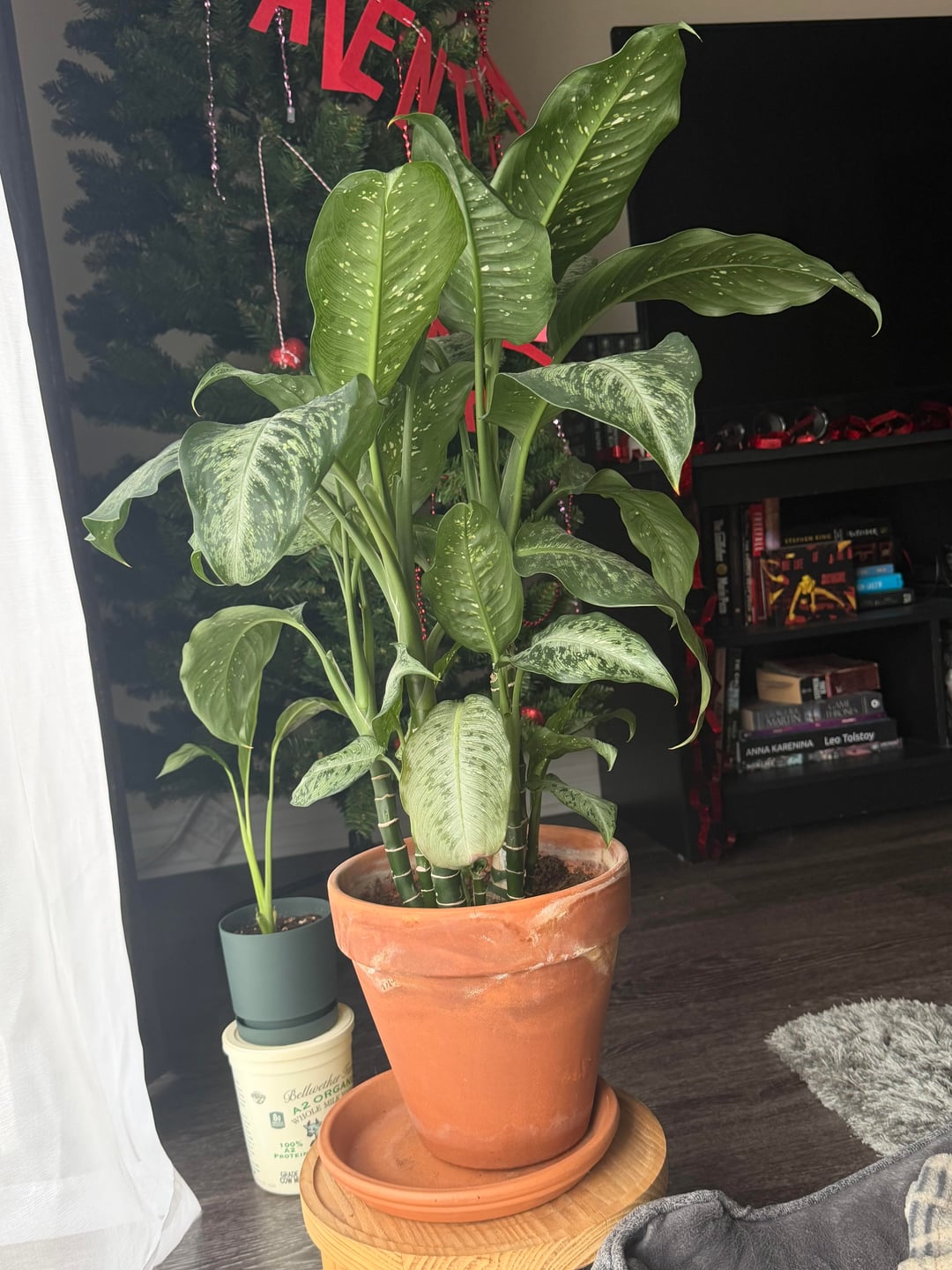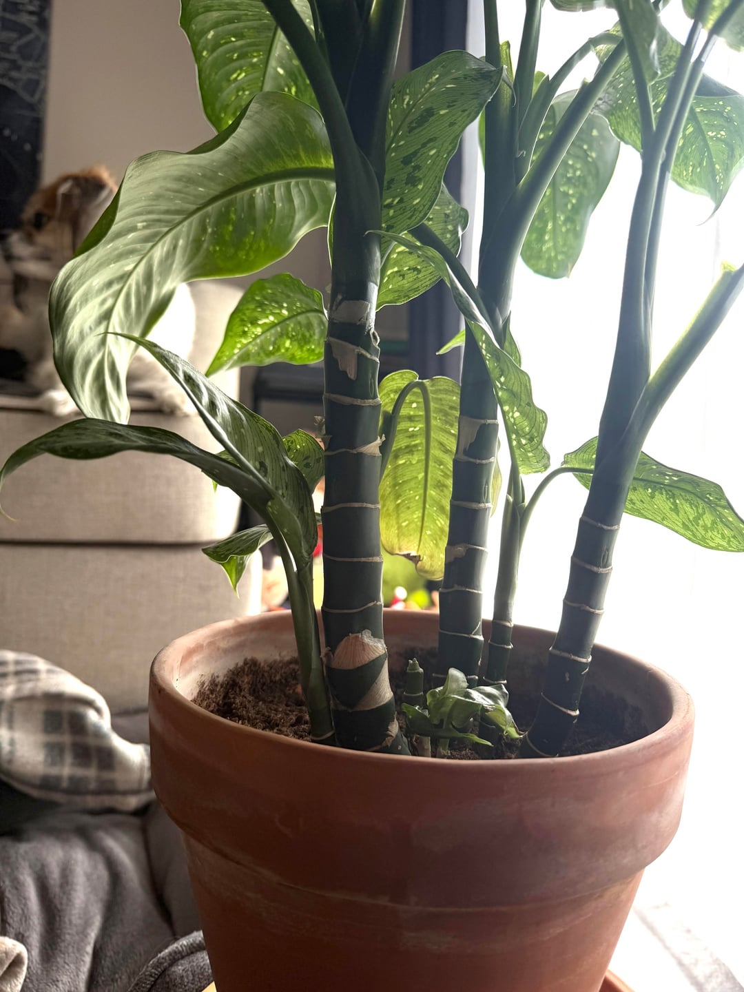 これが私のディーフェンバッキアです。私は観葉植物に関しては初心者ですが、この人をとても誇りに思っています。 1年前に購入しましたが、大きく成長してとても幸せそうです。春が近づいてきた今、今年は鉢のまま放っておくべきか、植え替えるべきか迷っています。
