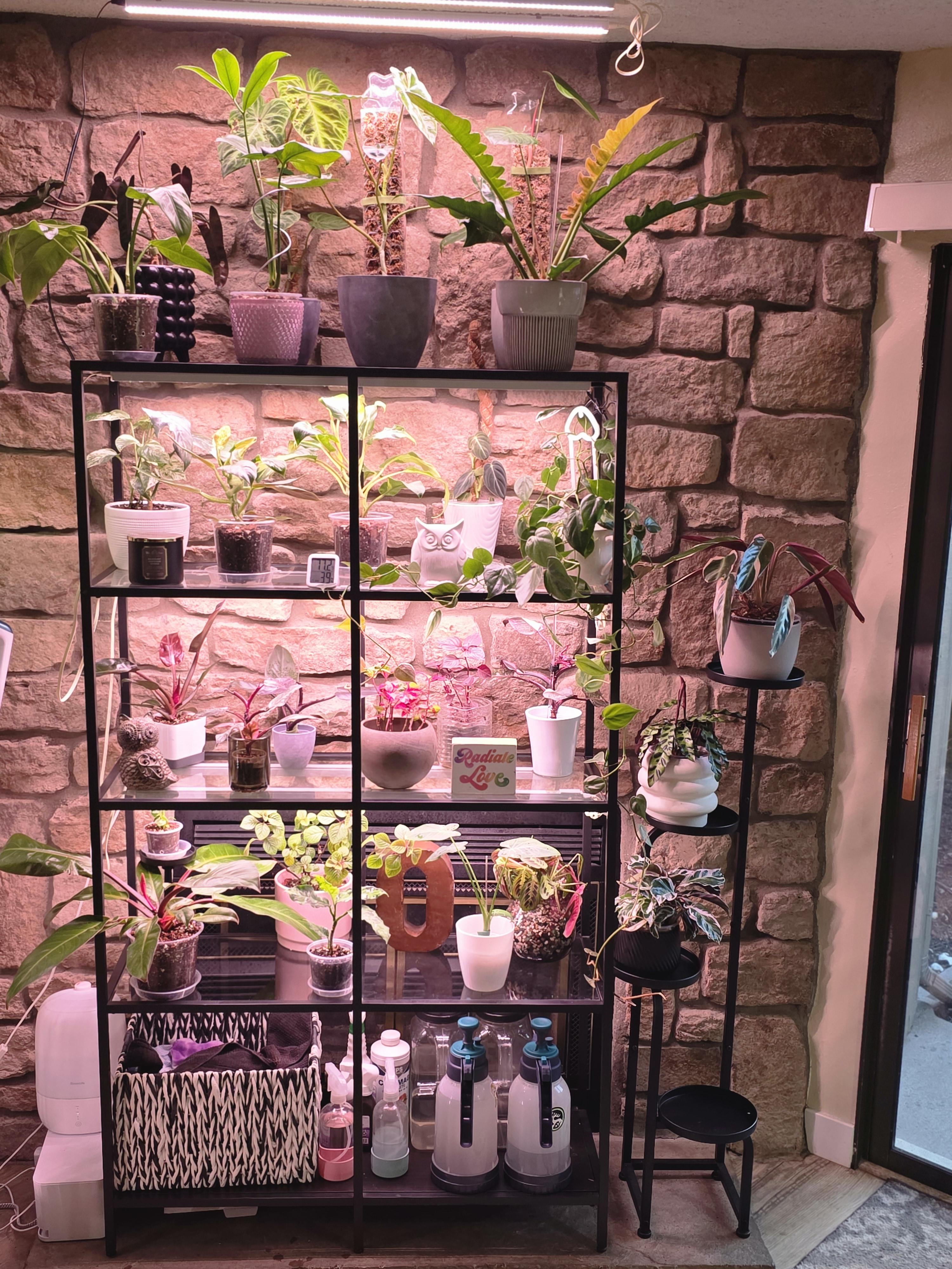ケーブル管理に注意しなければならないことや、ポットを購入しなければならないこともありますが、建設的なフィードバックを得るために、私の最初のラフ ドラフトのヴィッツヨ植物ディスプレイを共有したいと思いました。好奇心旺盛な動物のため、植物を床の高さに置くことができません。ディスプレイが他のインテリアにどう溶け込むかという風水的な要素も加えていきたいと思っています。キャラクター用に額装した写真を1枚か2枚追加する予定です。私たちはインテリアにユーモアが好きなので、ペニストレリスを追加しました 😅 ガラスの棚が欲しいと思っていましたが、まぶしくて、各棚の下に白いバーがつながっているのが見えるのは、今では安っぽいので、何かカバーするものを買うかもしれません。このディスプレイは、ラッドスタワイドとパティオドアの間の未使用の暖炉の前に設置されています。新しく厳選されたものではなく、より居心地の良い雰囲気にする方法に関する提案は大歓迎です。