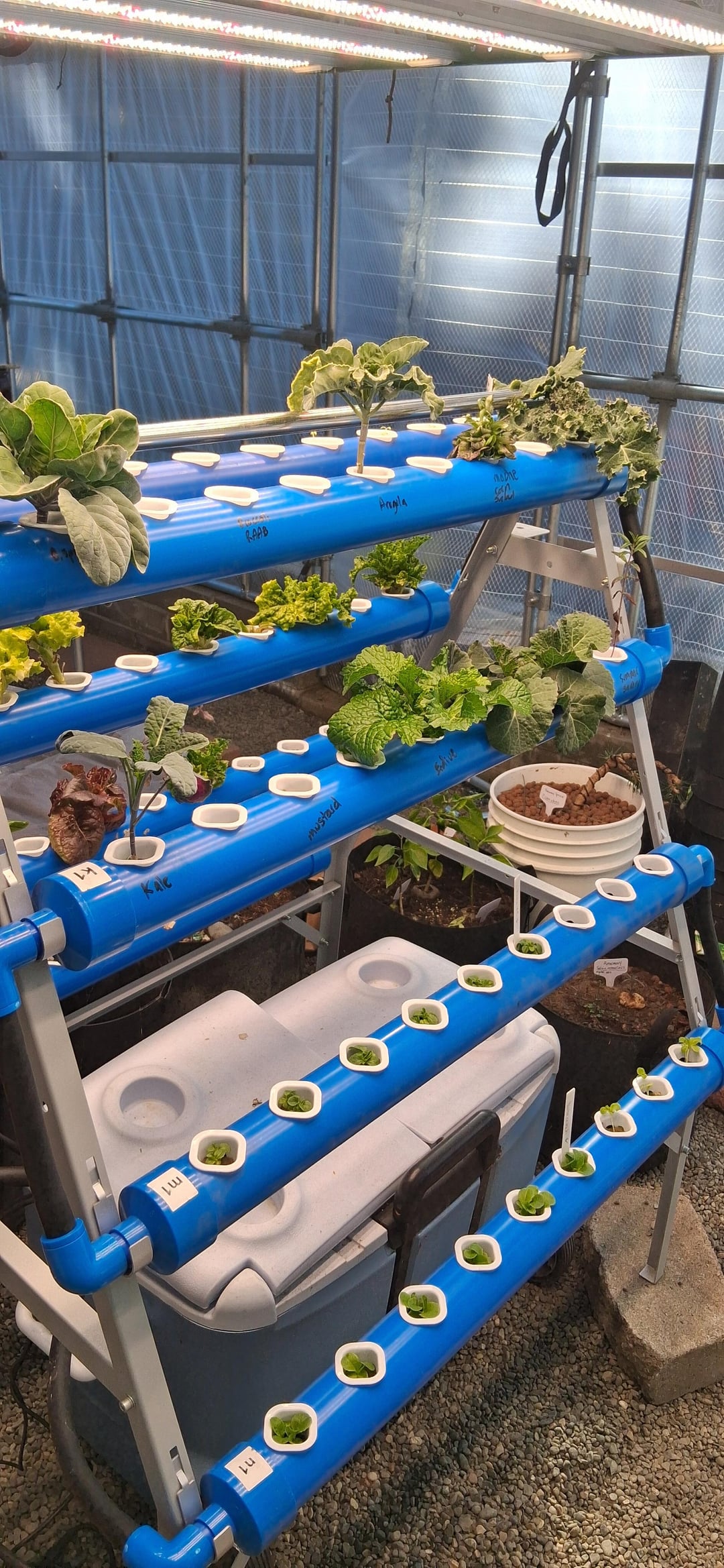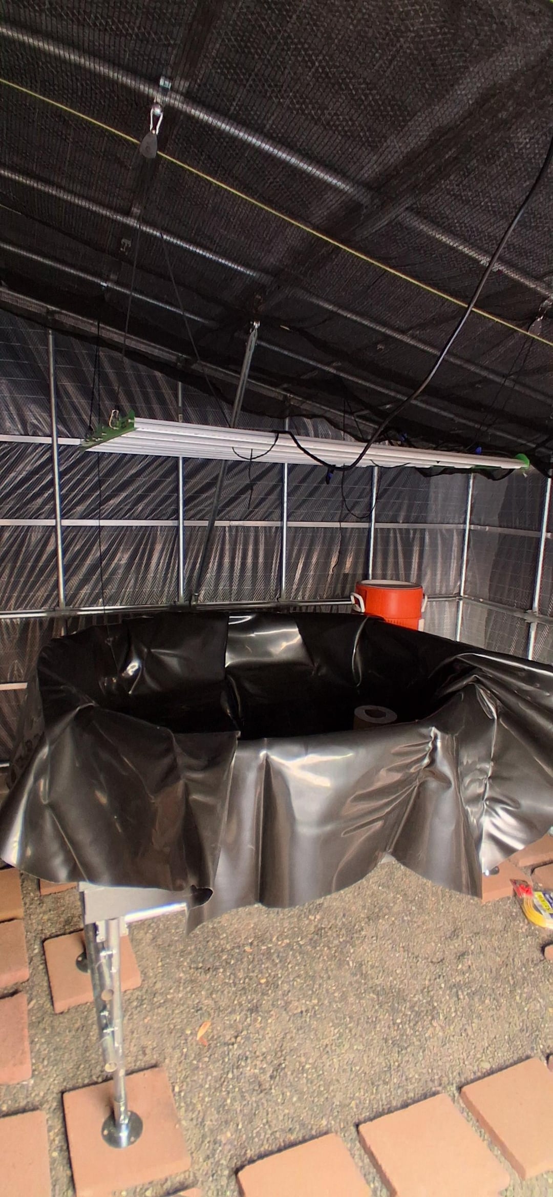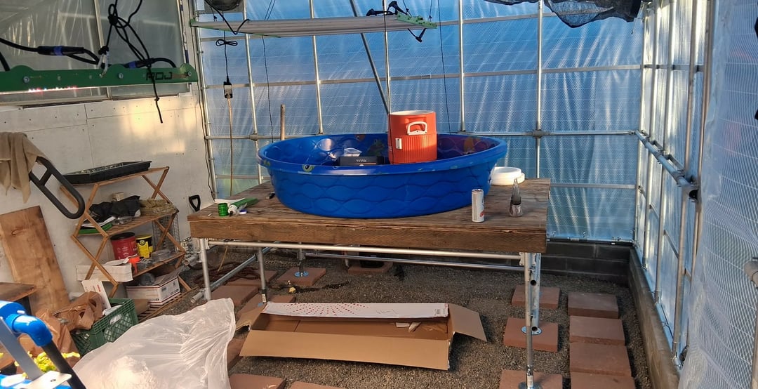 すべてを自分で行うと時間がかかりますが、これが私がこれまでに持っているものです…EPDMライナーで覆われた2つのHDPE子供用プールが一緒に積み重ねられ、ベルサイフォン排水管も取り付けられています…300ガロンの家畜用水桶を使用すると、配管が簡単になるようにテーブルの下にあります。固体微粒子フィルターには 5 ガロンの水差しを使用します。ベルサイフォンの建設の次はレカボールです。水耕栽培のレタスタワーが動き始めています。私が使用している LED バラストは 48 インチ×48 インチで、750 ワットだと思います。去年植えたベビーブレスの写真も今年出てきました:)