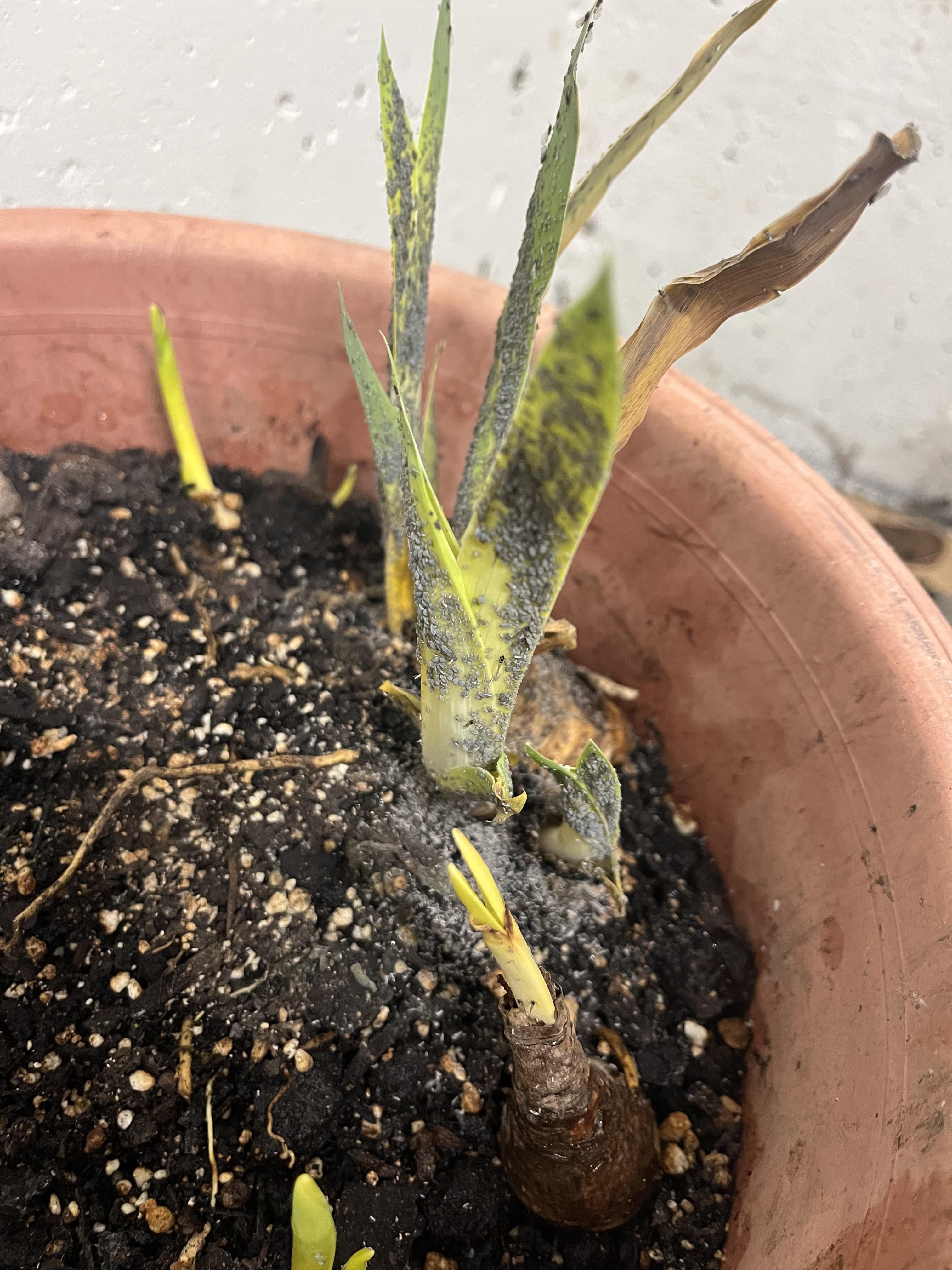これらは蔓延しているヒゲアイリスです。どうすればいいですか?海外に行っていた間、植物をガレージに2週間放置していたのですが、戻ってきたら灰色の虫の群れが集まっていました。同じ鉢の中の水仙には虫はなく、アヤメだけに付いています。私は週に一度水やりをしますが、週に一度だけ明るい暗いガレージに保管します。 Googleの推奨に従い、秋にこれらの鉢に植えました。