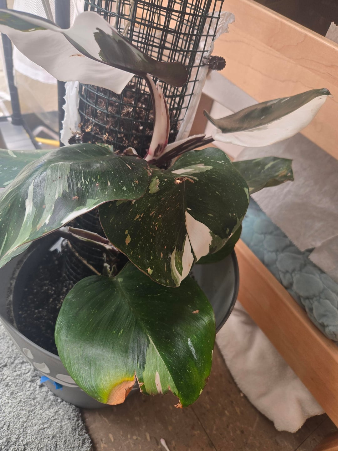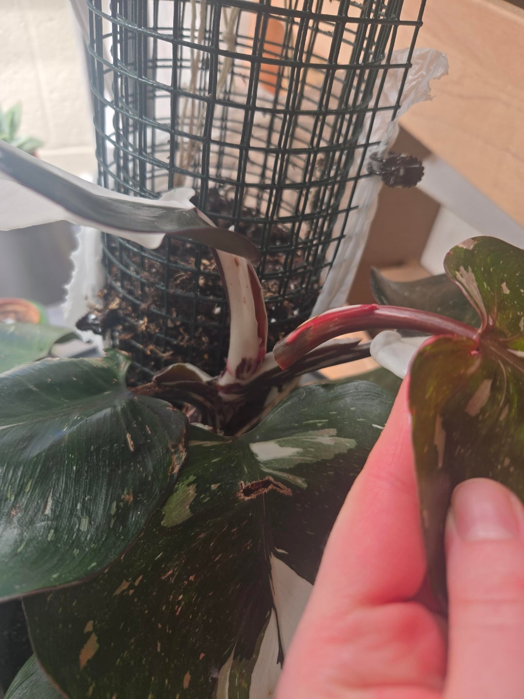 白騎士フィロデンドロン。隙間の上に水が溜まってしまい、茎が少し腐って弱ってしまったのだと思います。これがどのようにして成長し続けることができるか、または成長し続けることができるかどうか知っている人はいますか?アザミウマの有無を確認していたのですが、ちょうど真新しい葉っぱが落ちてしまいました。