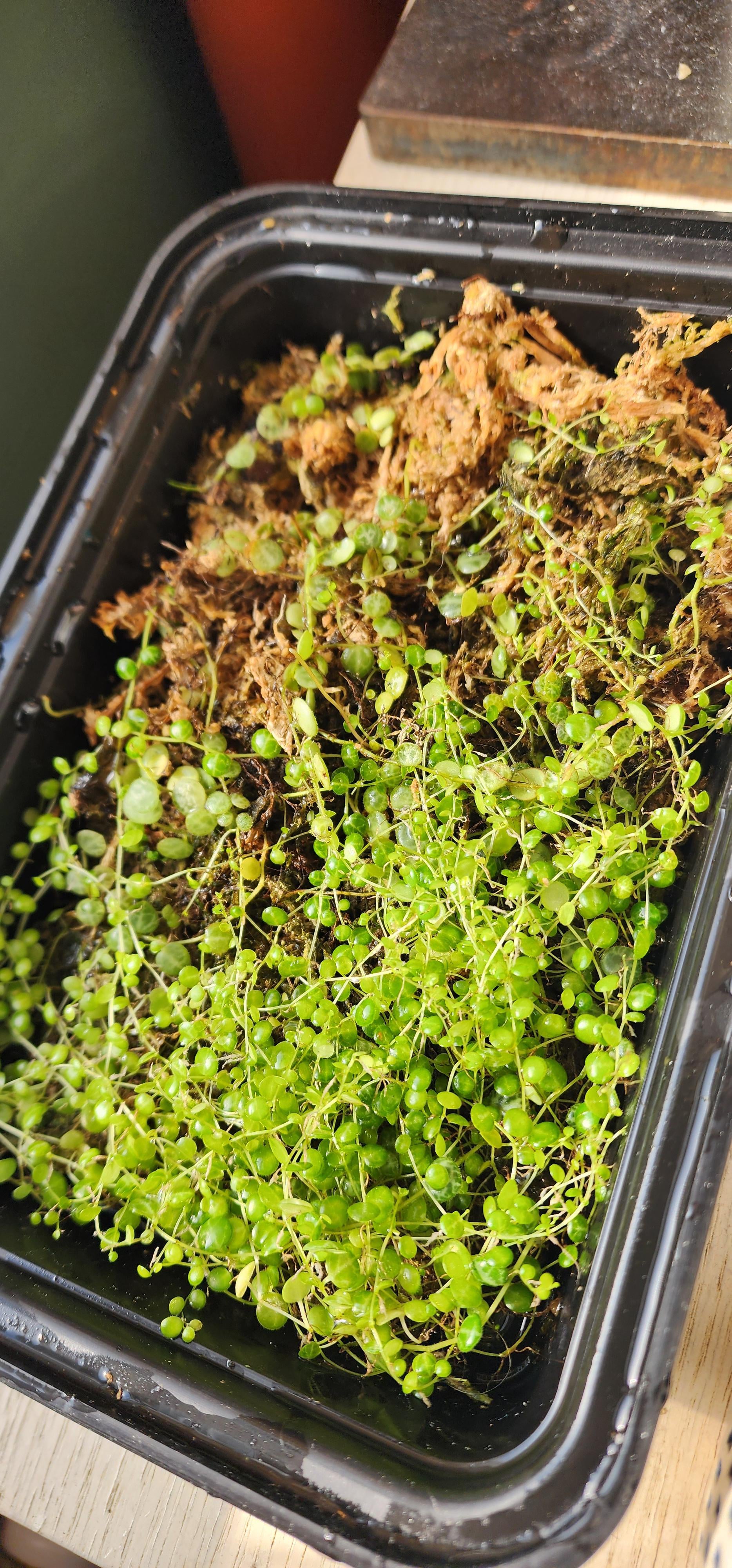 私は「String of Turtles」にずっと苦労してきました。私は数本の蔓を回収し、ミズゴケの入った古い中華料理の容器に突っ込んで、大きな植物の後ろの窓辺に何ヶ月も忘れていました。